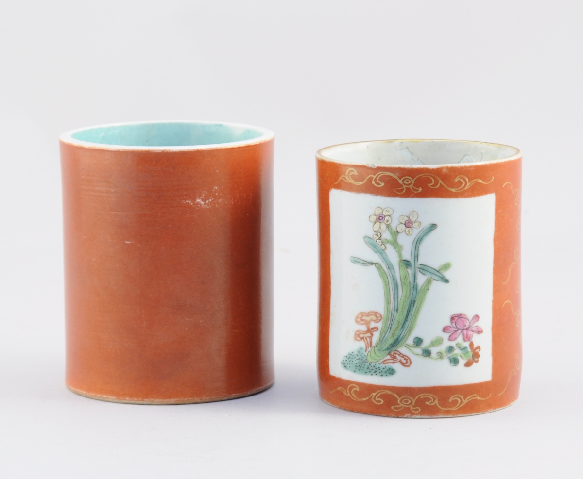 CHINE. POT À PINCEAUX en porcelaine à décor d'émaux polychromes orné d'un cartouche rectangulaire à scènes de jardins sur fonds rouge. Étiquette "Mon F. Langweil" à Paris".