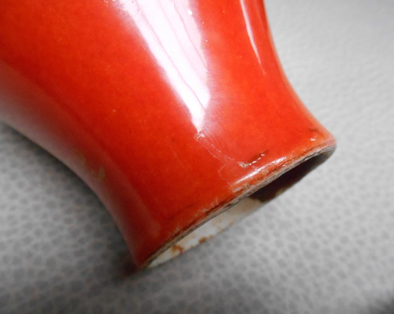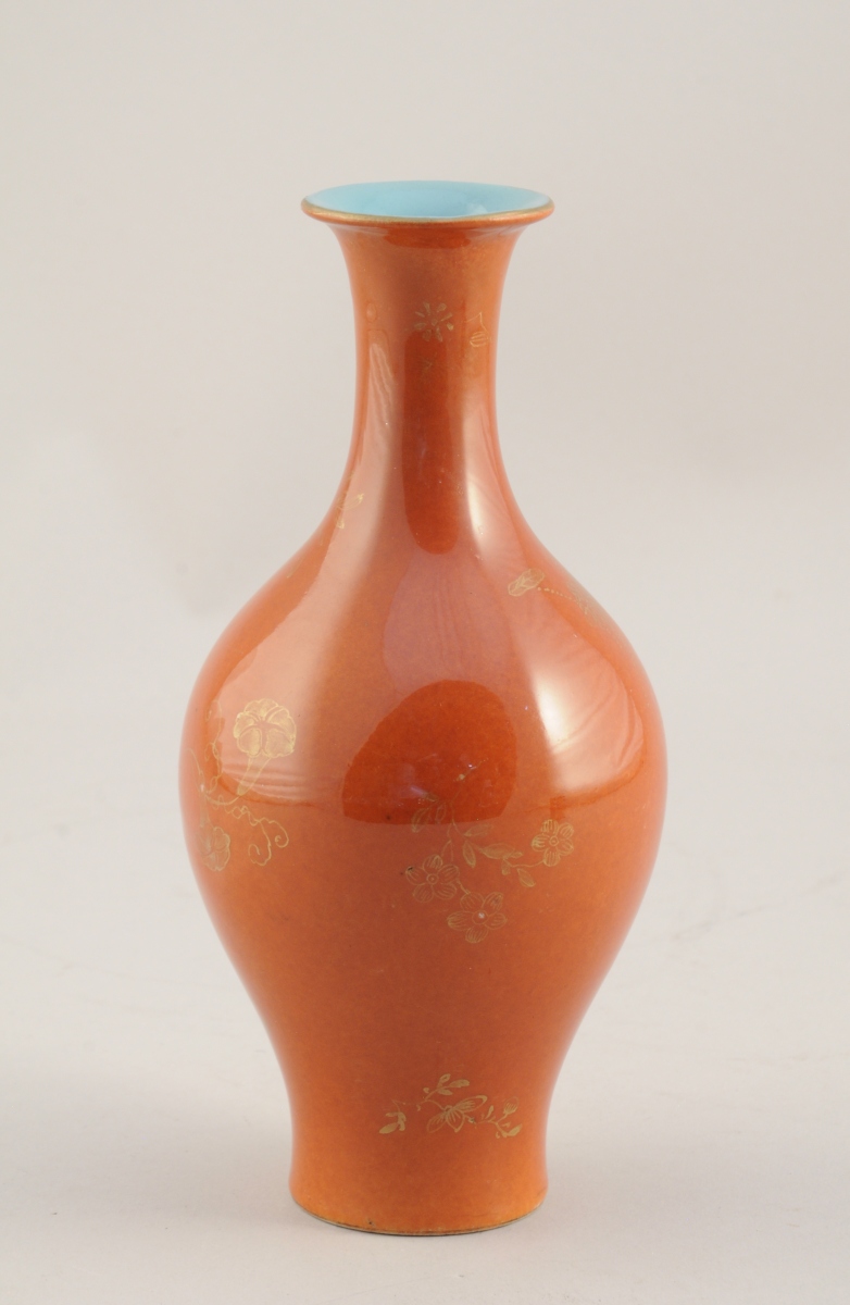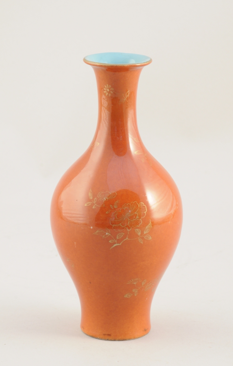 CHINE. VASE BOUTEILLE en porcelaine corail à motifs peints à l'or, l'intérieur turquoise.