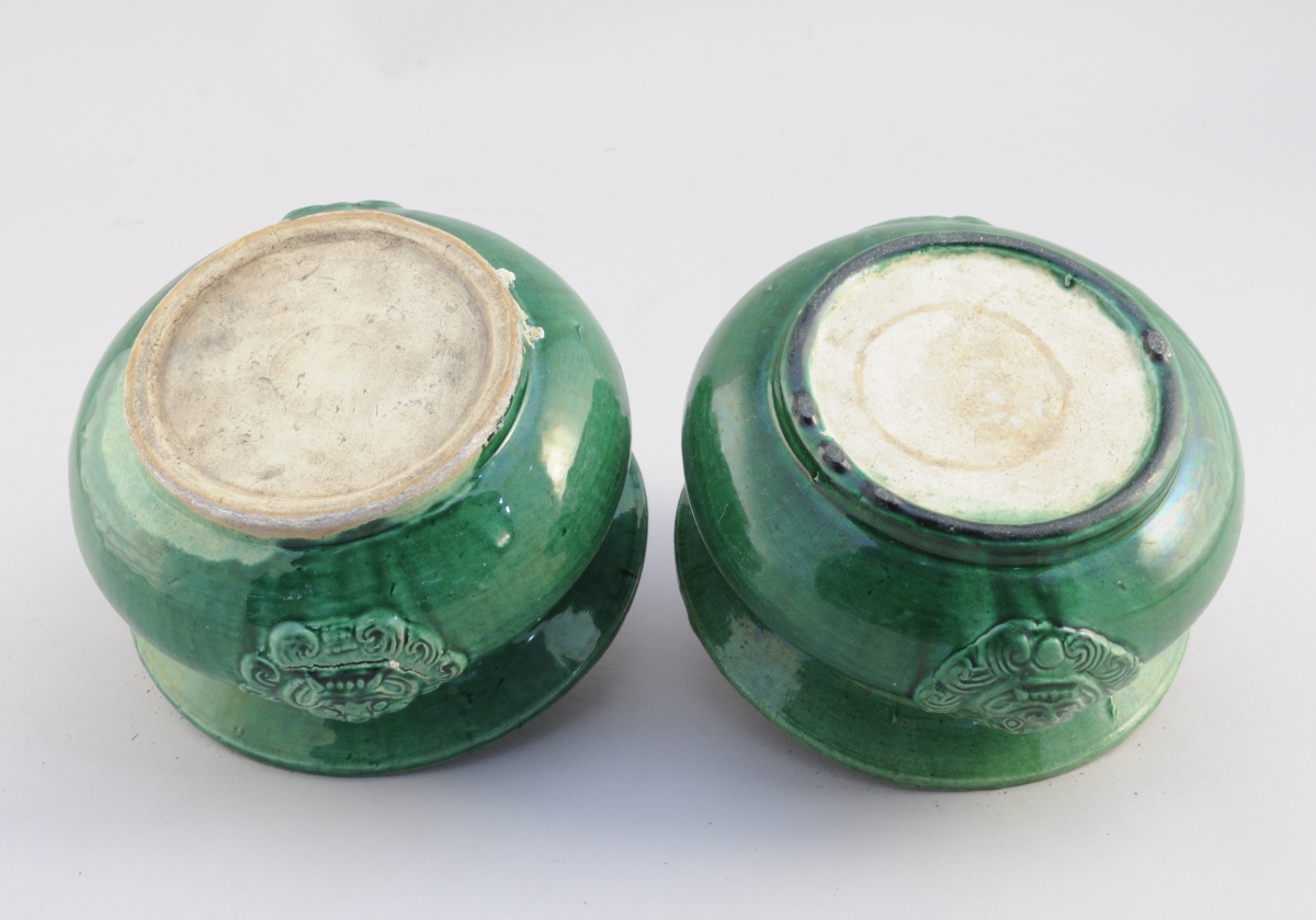 CHINE. Deux CRACHOIRS de forme circulaire en terre cuite vernissée verte, anses à mufles de lion.