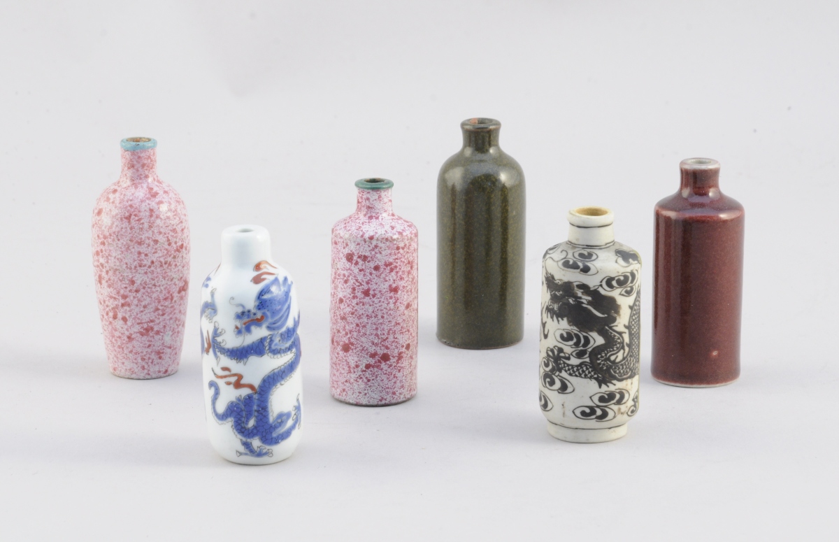 CHINE. CHINE. 6 FLACONS-TABATIÈRES en porcelaine rose, verte, noire et blanche et une à motif d'un dragon.