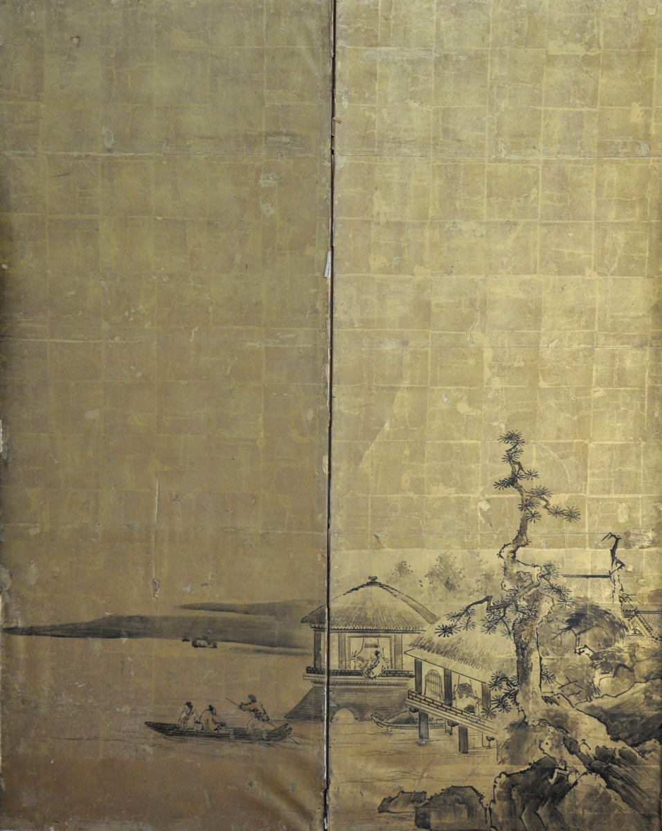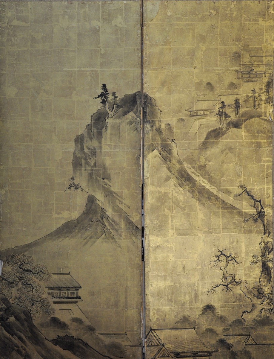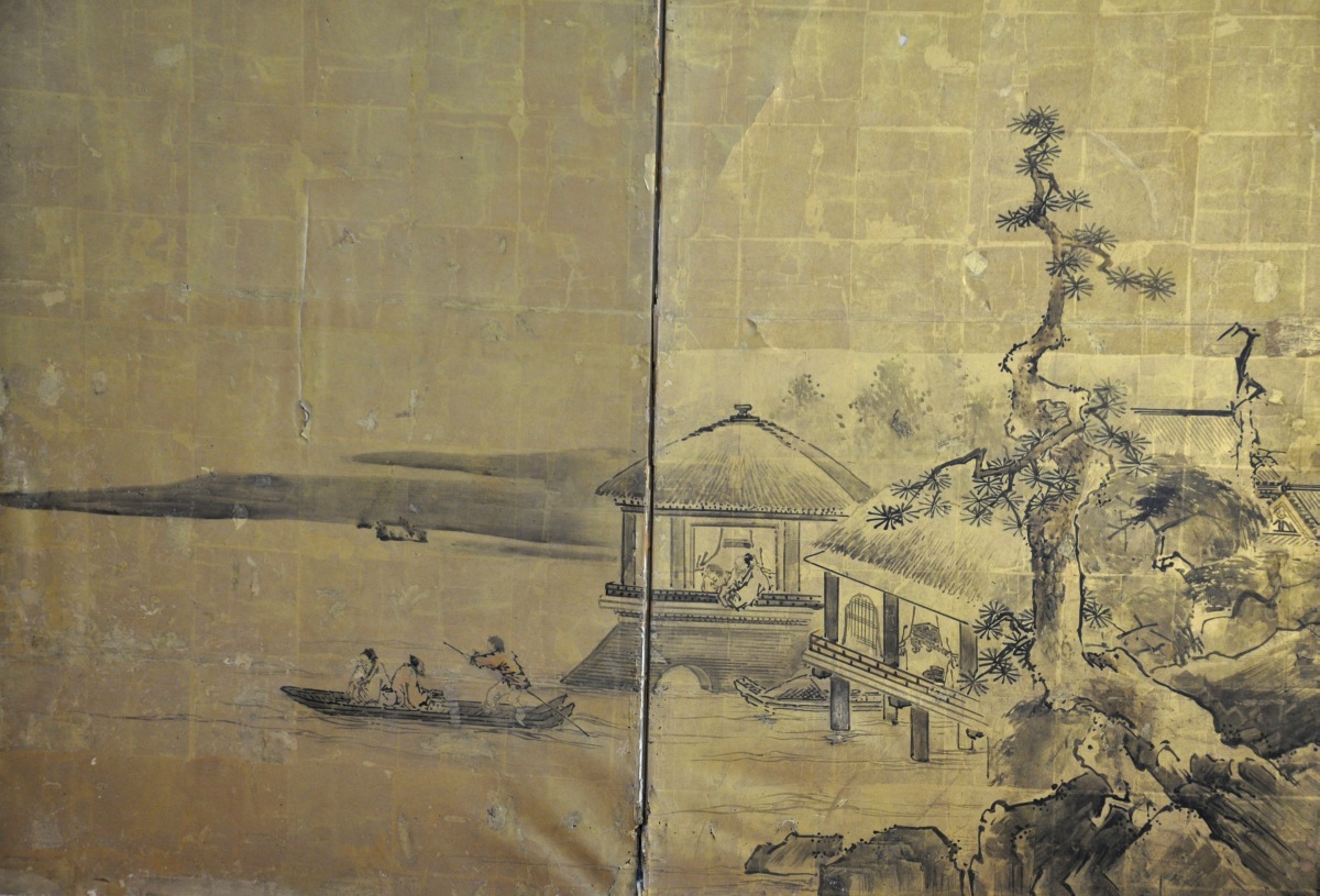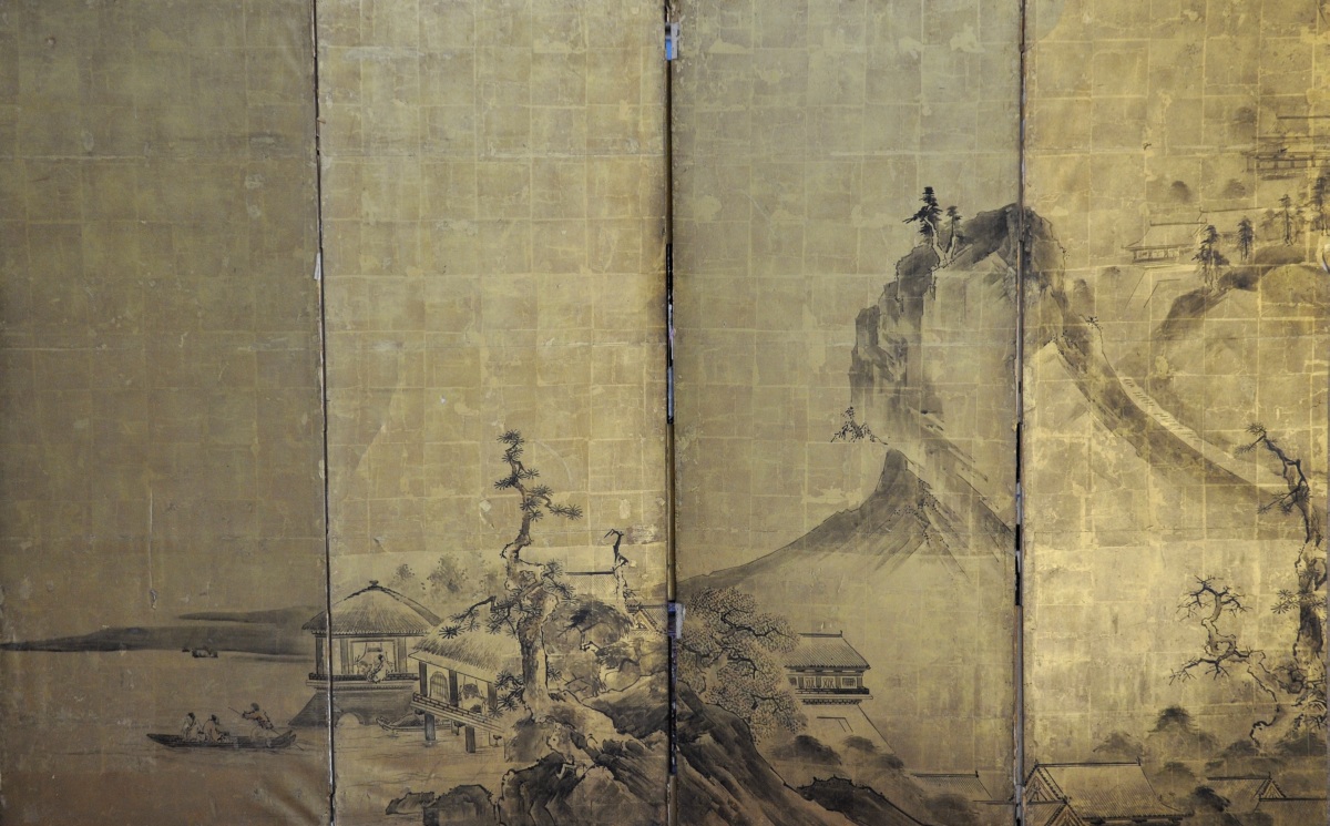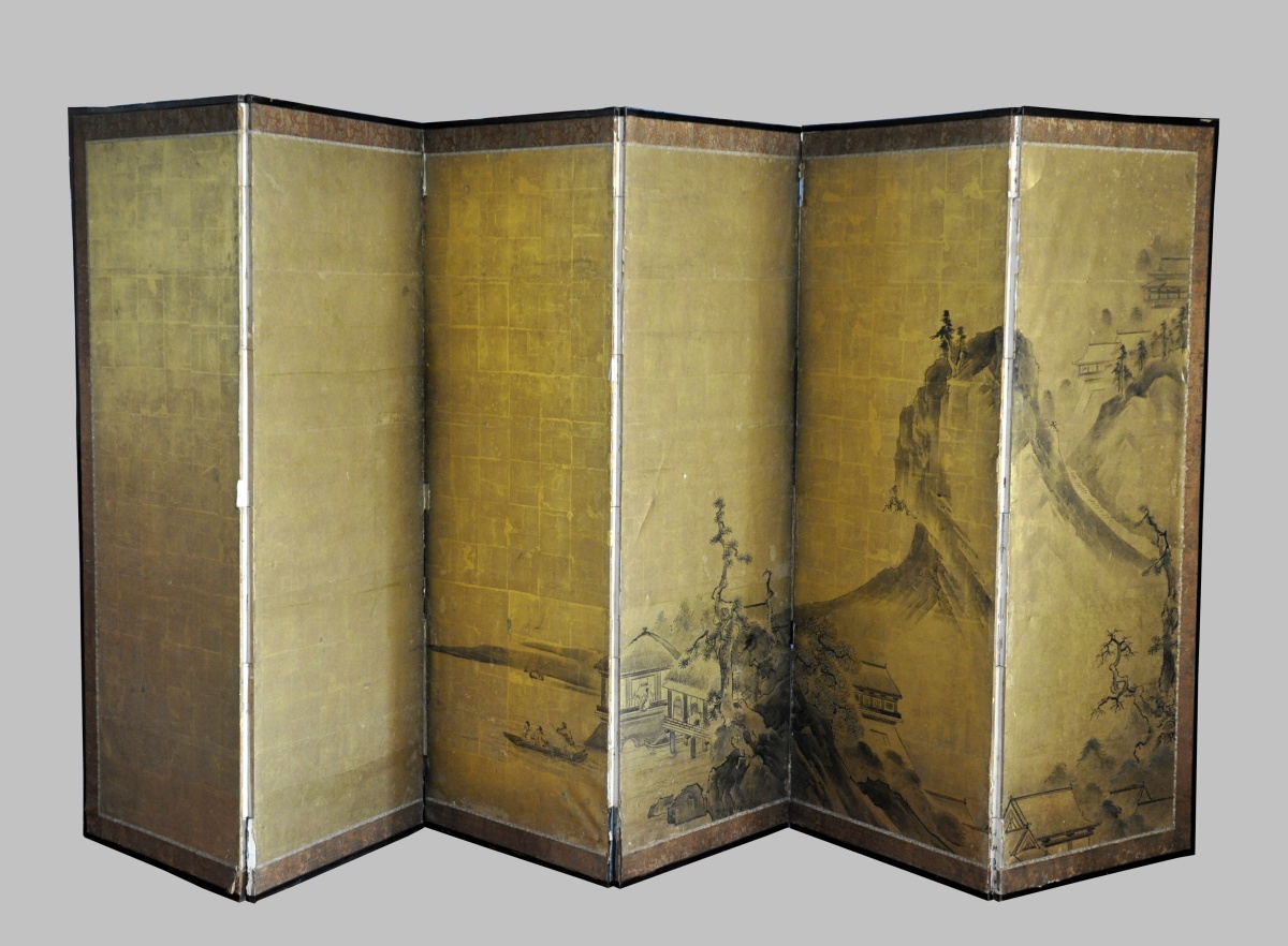 JAPON. Grand PARAVENT à fond de feuille d'or figurant une scène de montagne et de paysage. 6 larges feuilles de papier.