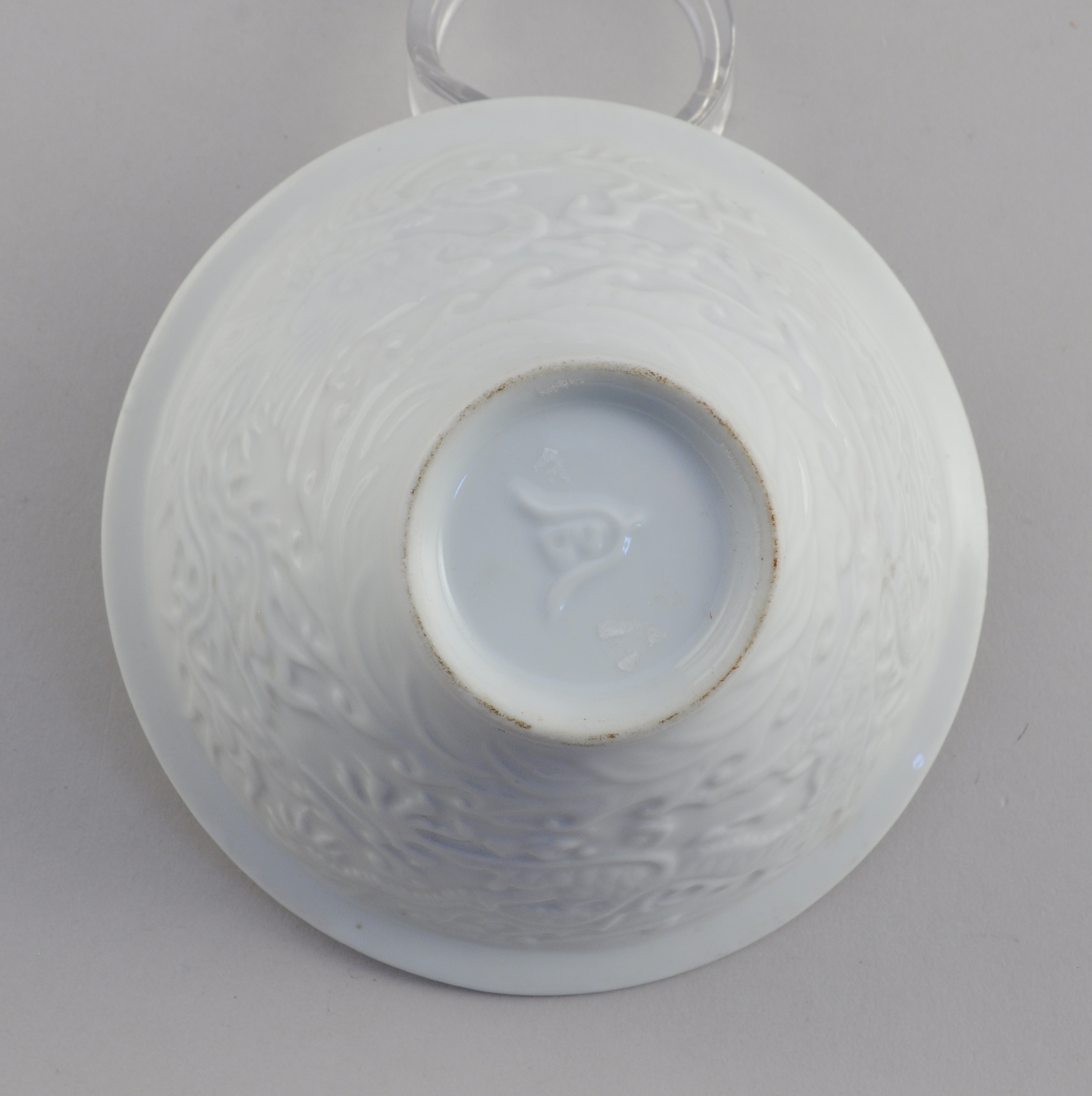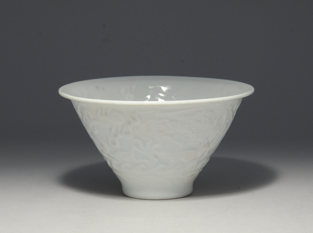 CHINE. BOL en blanc de Chine à décor en léger relief d'un dragon et d'un phénix pourchassant la perle sacrée à travers les nuées.