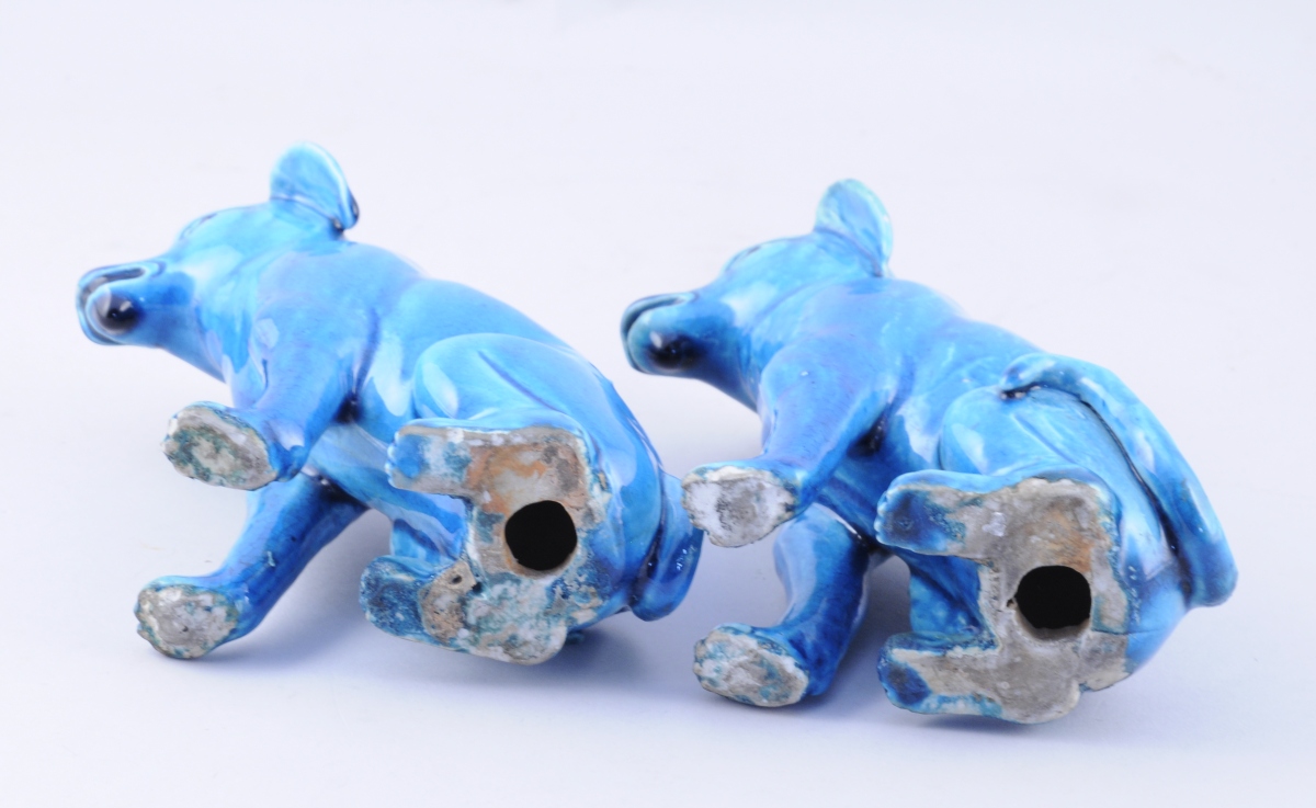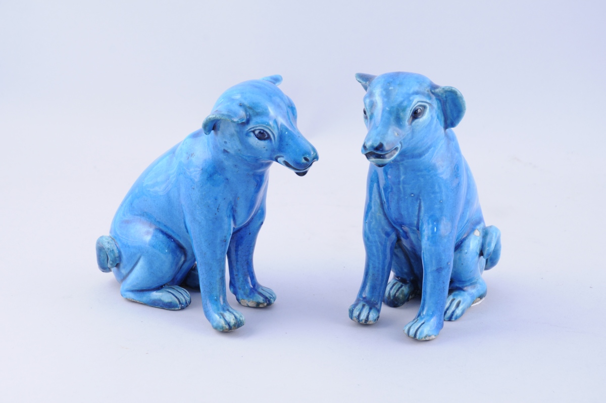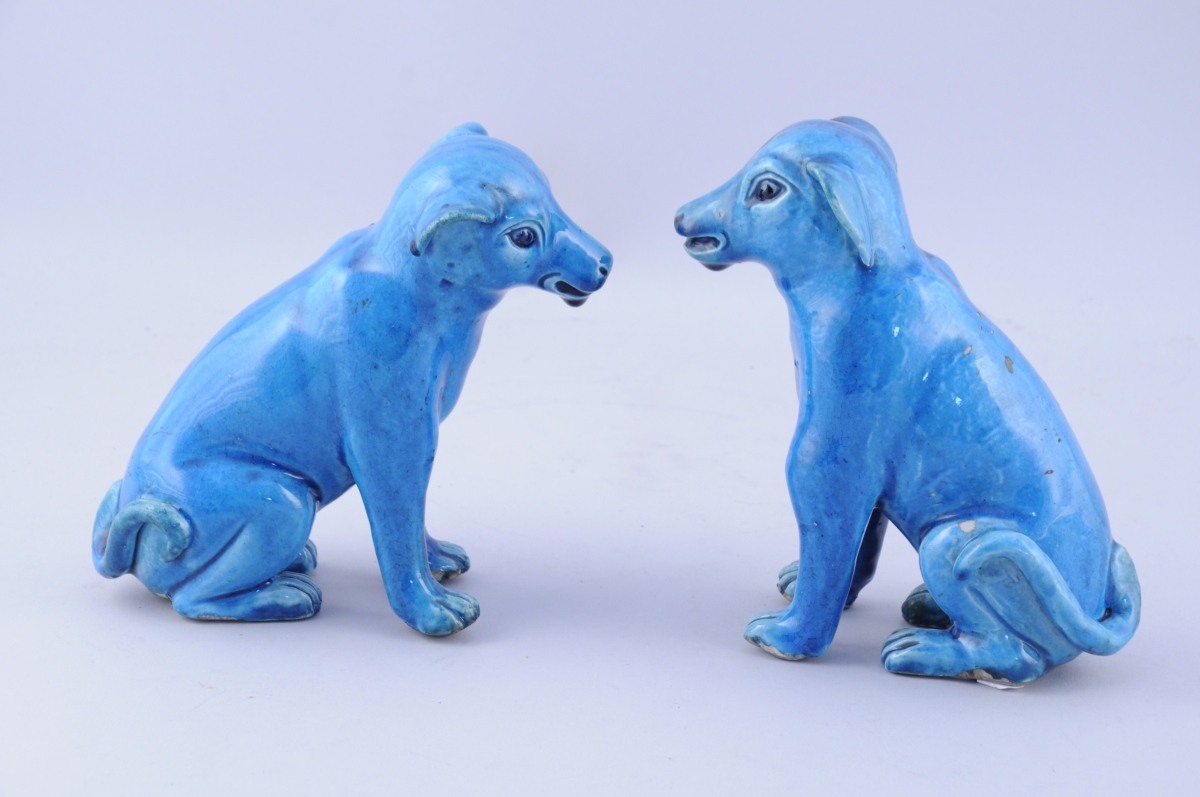 CHINE. Paire de CHIENS assis en porcelaine émaillée bleu turquoise craquelé.