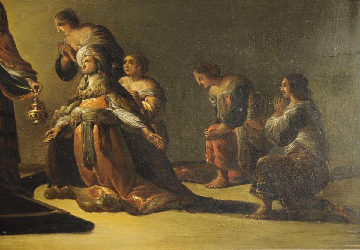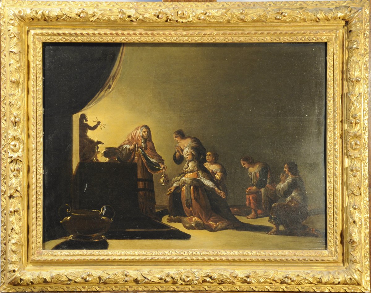 Peintre du siècle d'or Hollandais, Thievaert, à qui notre panneau est attribué, ne verse pas dans une scène mythologique classique mettant en scène Jupiter, mais explore avec talent le côté sombre de la divination, bravant ainsi l'interdit religieux exprimé dans le livre de Samuel "Laissez les mort là où ils sont !". Son audace dépasse les représentations bibliques de "Saül et la sorcière d'En-dor" pour mettre en scène un jeune contemporain hollandais, richement vêtu, les bras tendus vers un autel où trône Jupiter, personnifié par son aigle et ses foudres. Une vieille sorcière effrayante enscence l'idole. Autour de lui quatre jeune femmes aux pieds nus, épaules découvertes et poitrine avantageuse l'accompagnent dans sa demande d'oracle auprès du père des dieux. Le traitement caravagesque en clair obscure confère à cette scène une manière inquiétante, la source lumineuse étant située derrière l'idole. Après les siècles de chasse aux sorcières, bien avant la tolérance du Grand siècle ni même les ombres romantiques du XIXe, Thievaert offre l'image d'un artiste libre et transgressif.