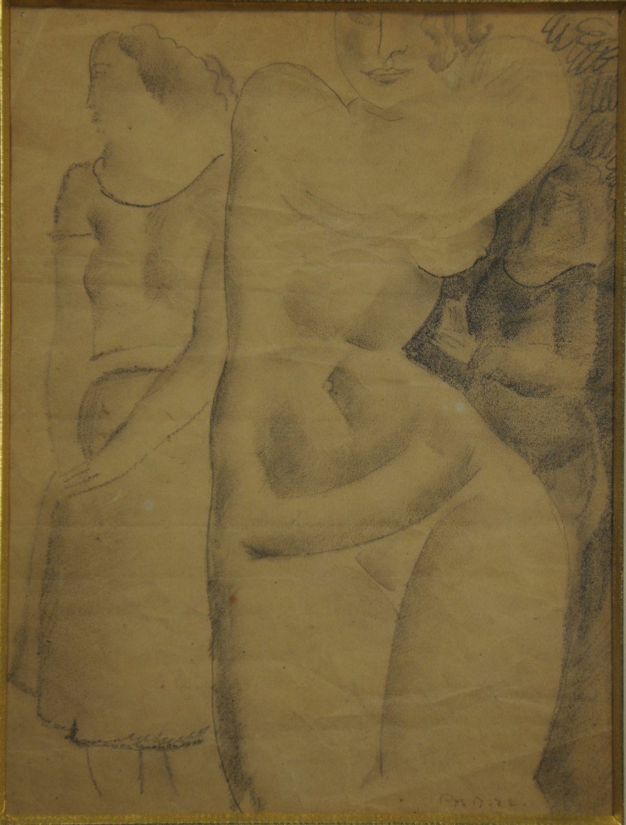 Graphite et estompe sur papier froissé. Signé R Th B. en bas à droite et daté 22.