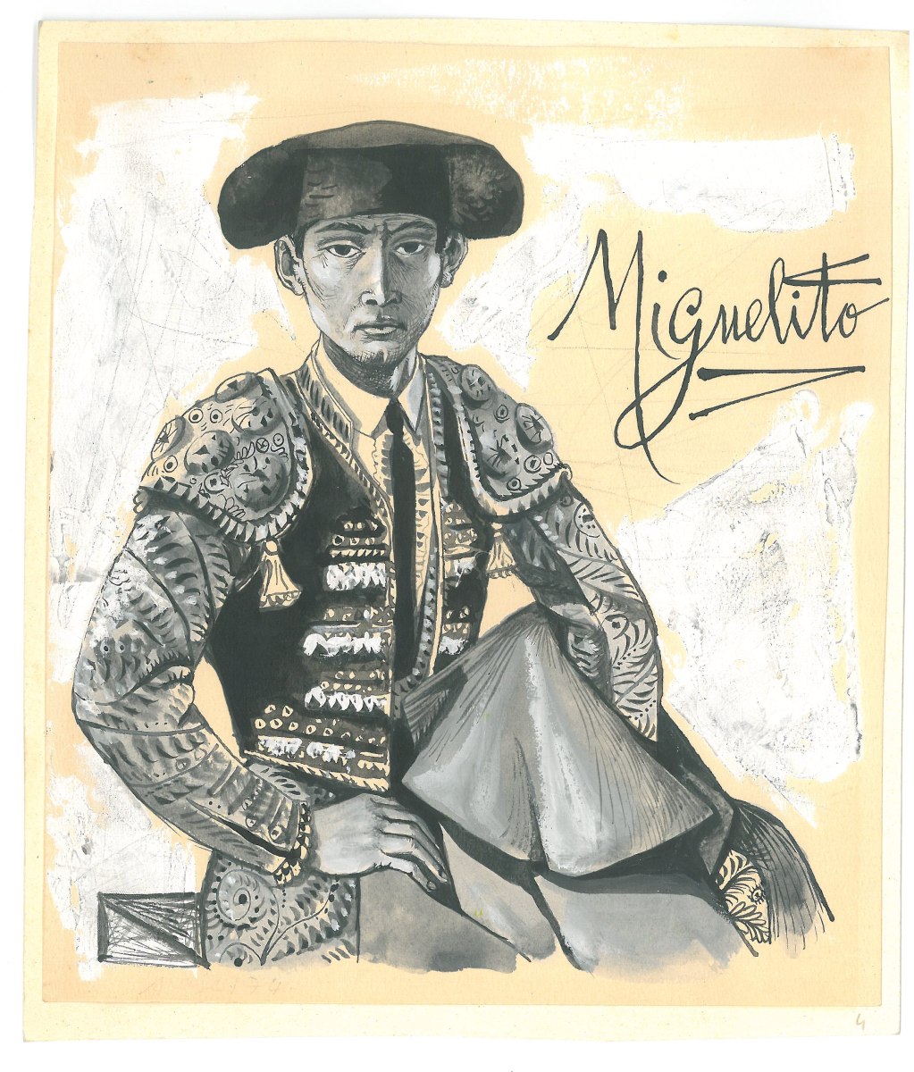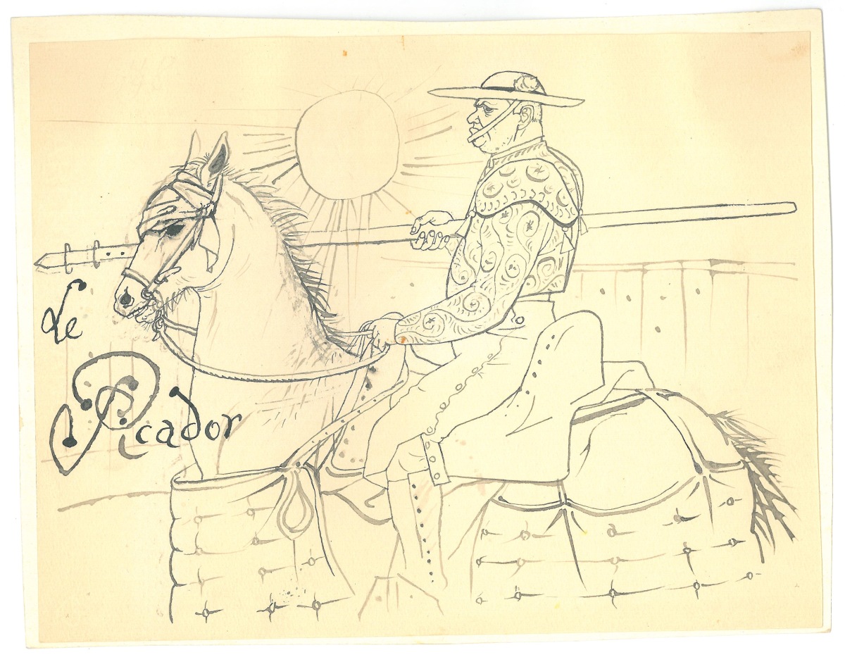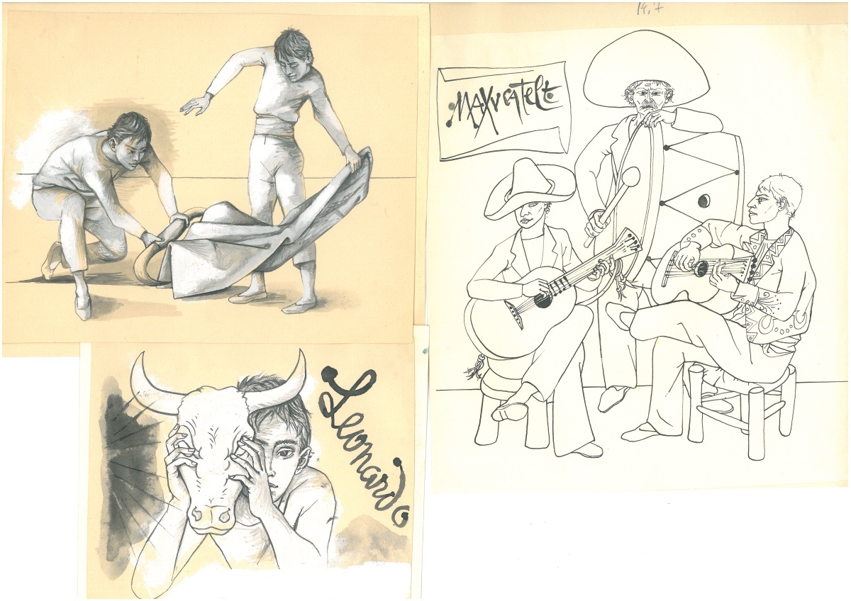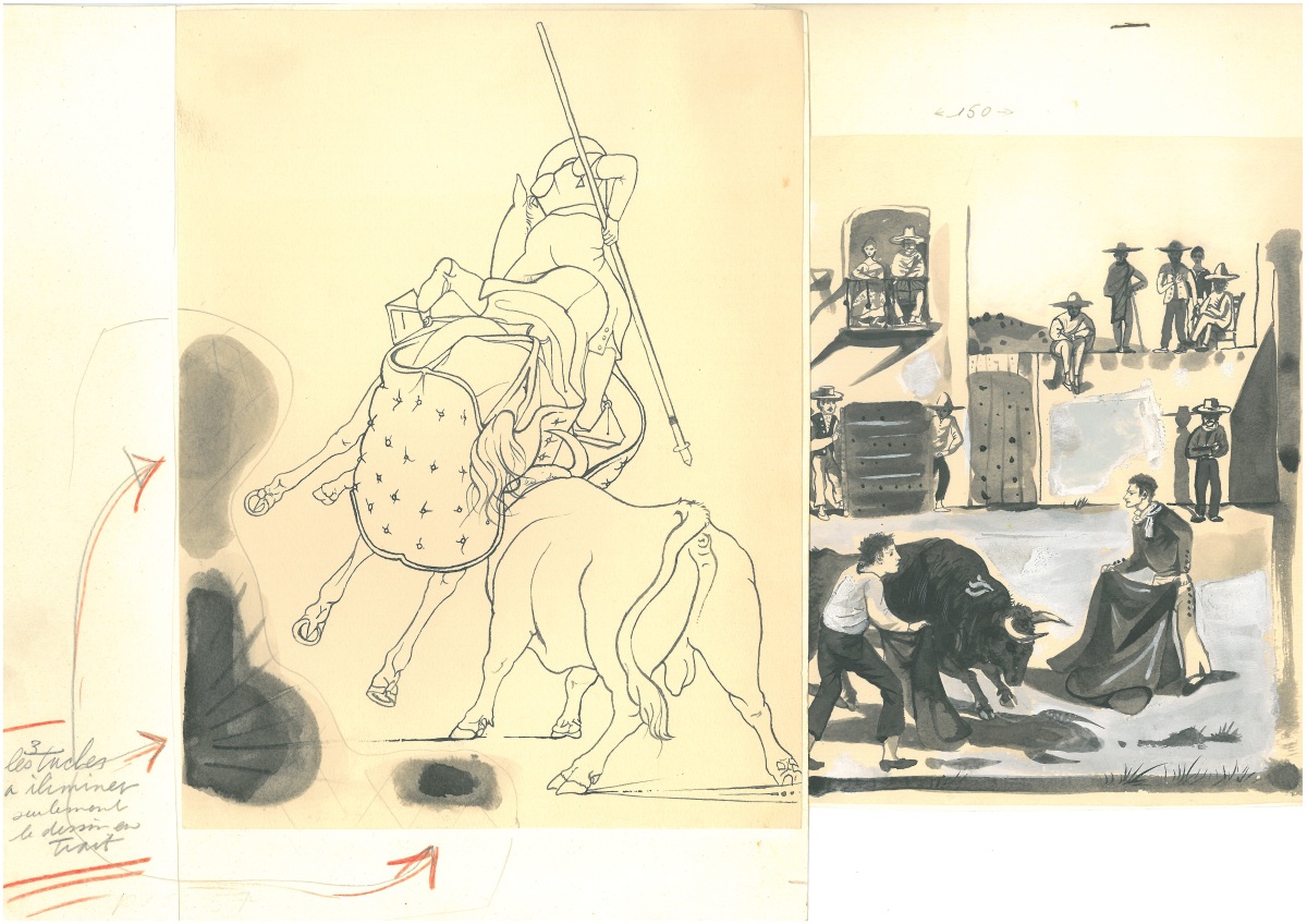 - " Léonardo et Gitano", encre et gouache signée avec précisions et indications, 27 x 35 cm. Double page de garde du début.
