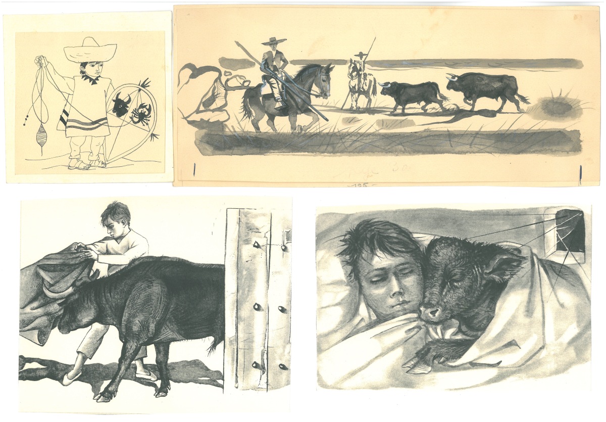 - Garçon et taureau, encre et gouache, 27 x 39 cm. Double page de garde de la fin.