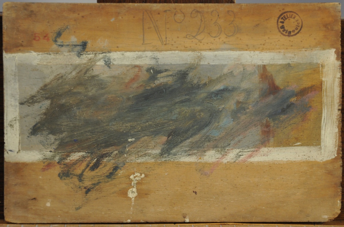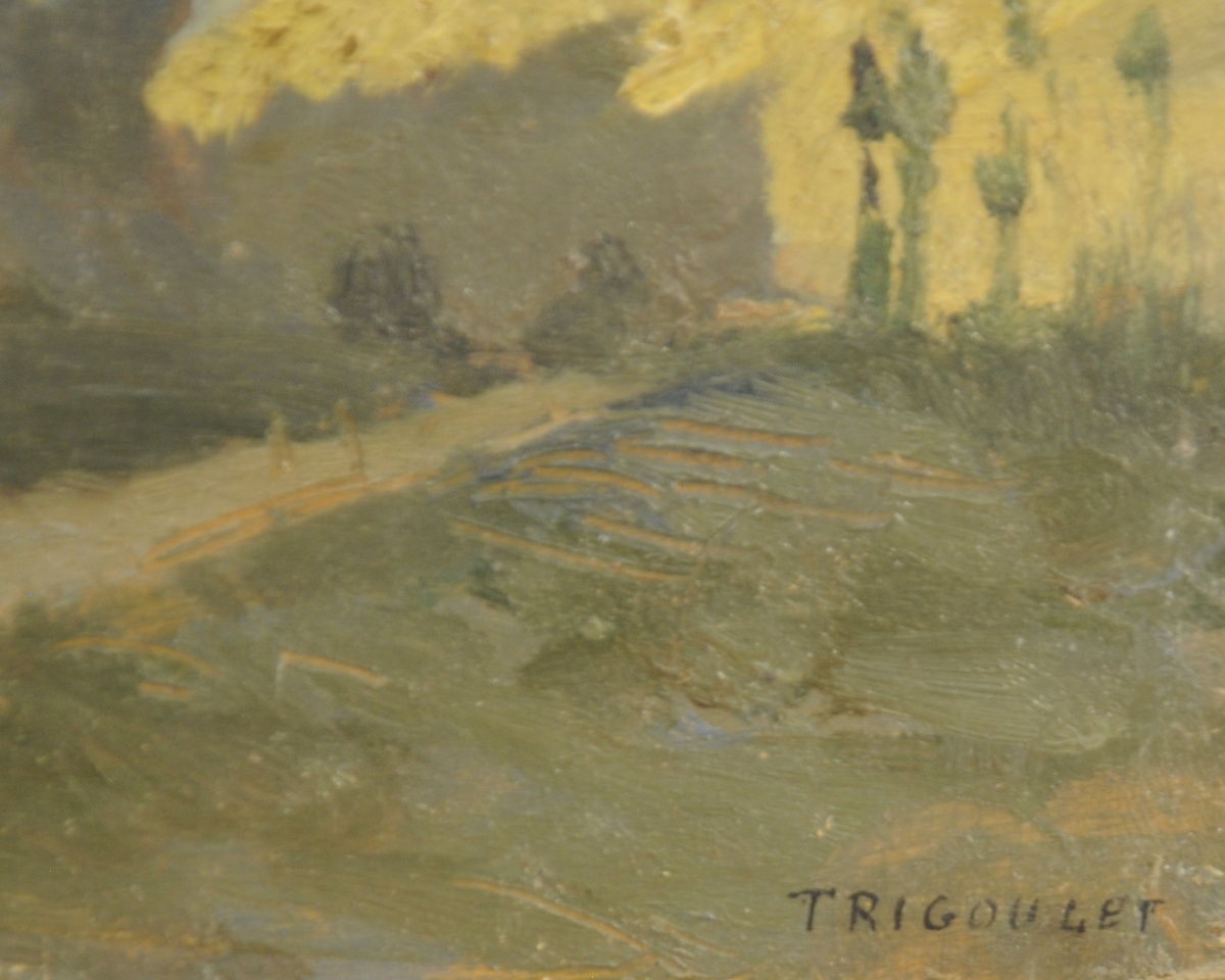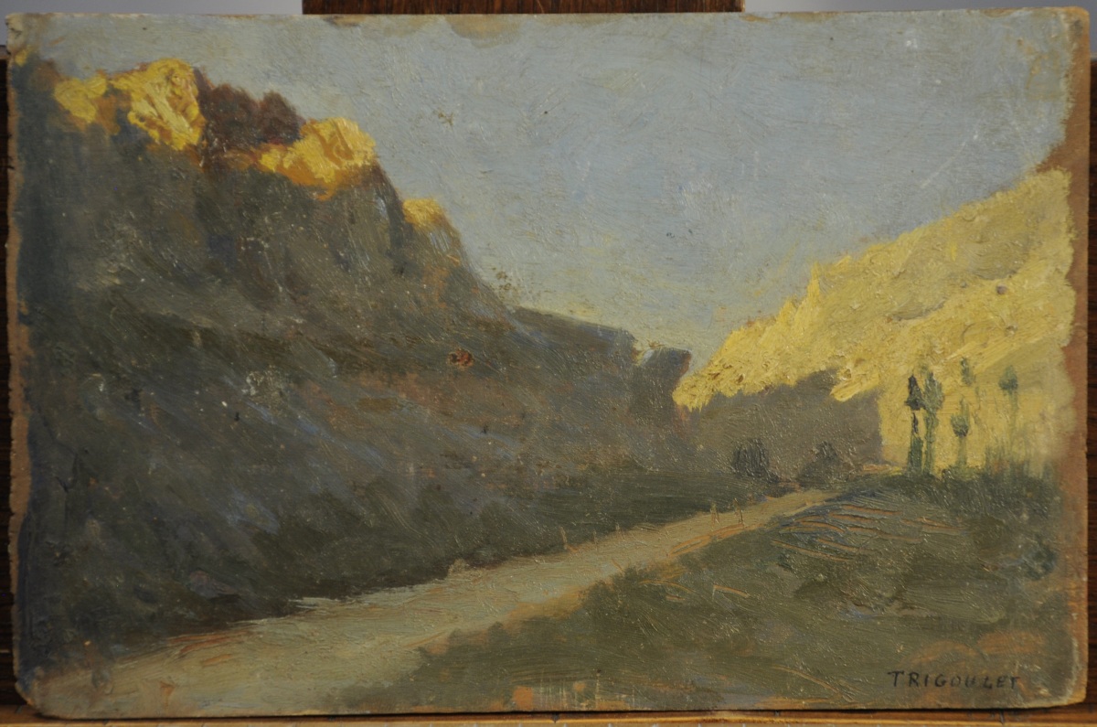 Huile sur panneau de bois, signée en bas à droite. Au verso : tampon de l'Atelier Trigoulet, recherche de couleurs et numéros.