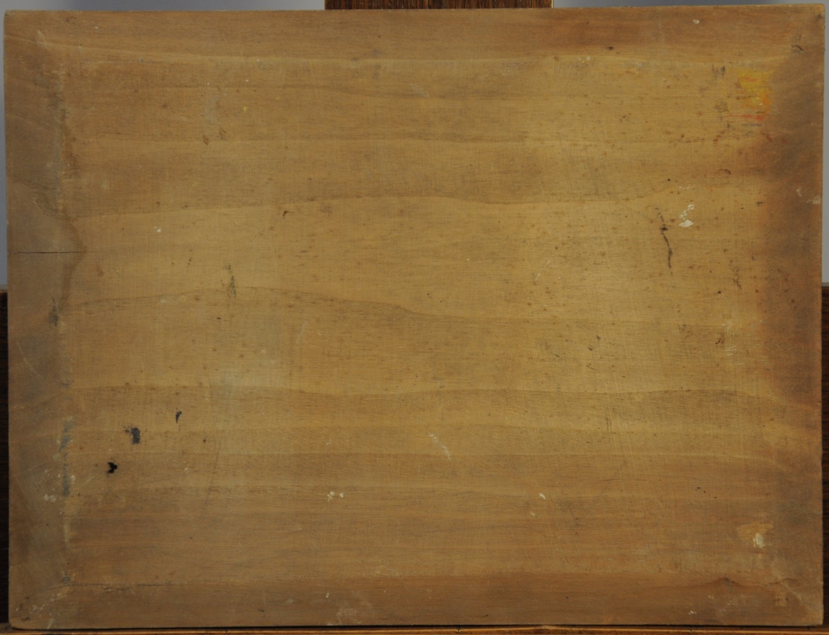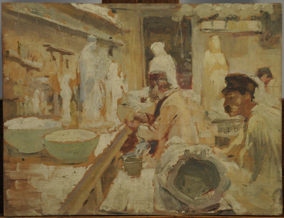 TRIGOULET.Hommes dans un atelier de modelage.Huile sur panneau de bois,...