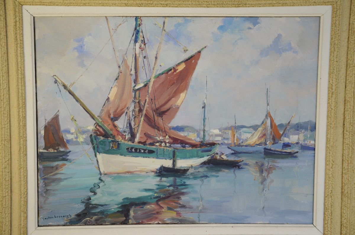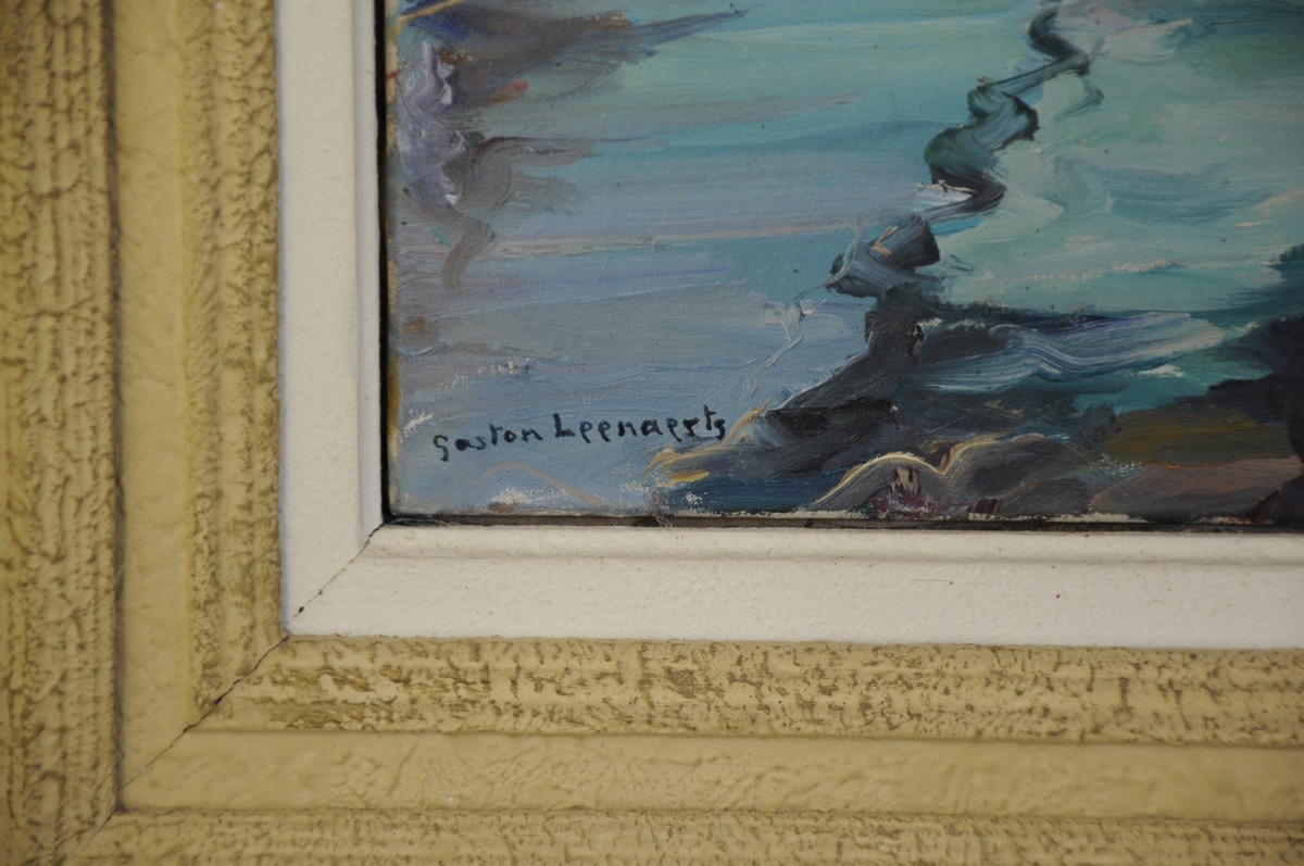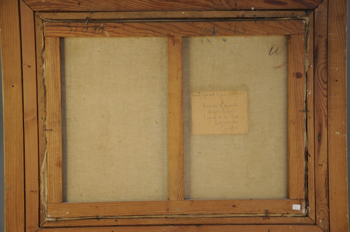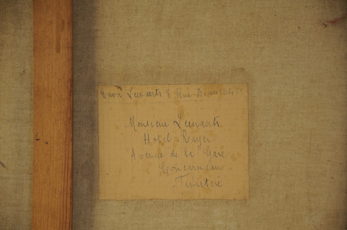 Étiquette manuscrite au verso : "Envoi LEENEARTS 8 rue Mozart, 6ème. Monsieur LEENEARTS Hôtel Rayer, avenue de la gare, Concarneau Finistère."