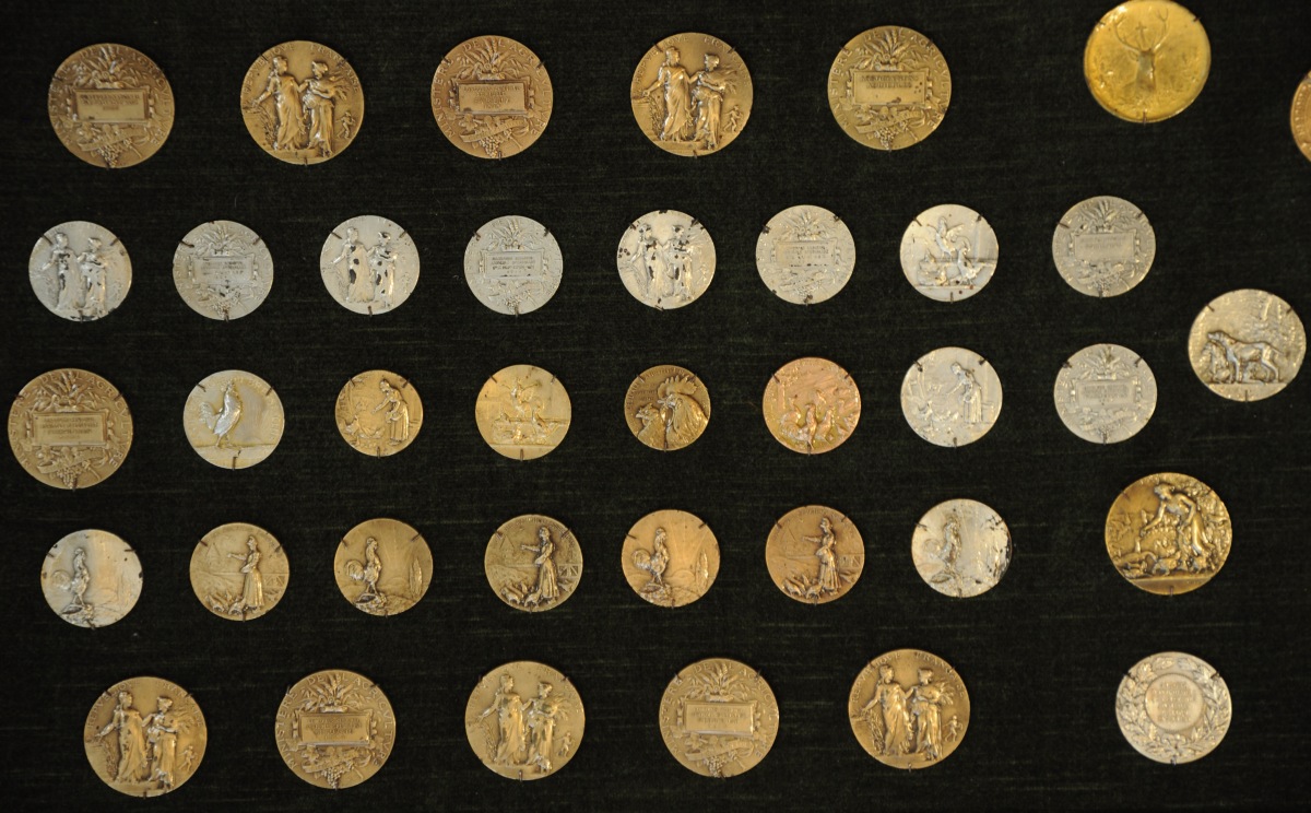 AGRICULTURE. ENSEMBLE de 84 MÉDAILLES de CONCOURS AGRICOLES et DEUX MÉDAILLES de CHASSE comprenant notamment une médaille du Ministère de l'Agriculture pour le " CONCOURS RÉGIONAL DE BEAUVAIS, 1914 " catégorie " ANIMAUX DE BASSE-COUR " ; une médaille de la " SOCIÉTÉ NATIONALE D'ENCOURAGEMENT À L'AGRICULTURE " marquée " PAIX et TRAVAIL " et une médaille de la " SOCIÉTÉ St HUBERT DE L'OUEST-NANTES " signée L. CARIAT. Dans un cadre en bois et bois doré sculpté de feuilles d'acanthe. La plus grande 6 x 8 cm. L'ensemble 45,5 x 141 cm. (quelques usures)