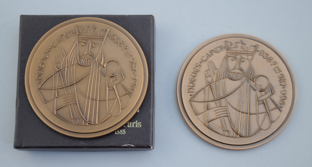 A/ .HUGUES . CAPET . 958 ?, une couronne, 987 . 996 . Buste de face d'Hugues Capet couronné tenant le sceptre et l'orbe. Signature MAURICE POUZET (1921-1997).