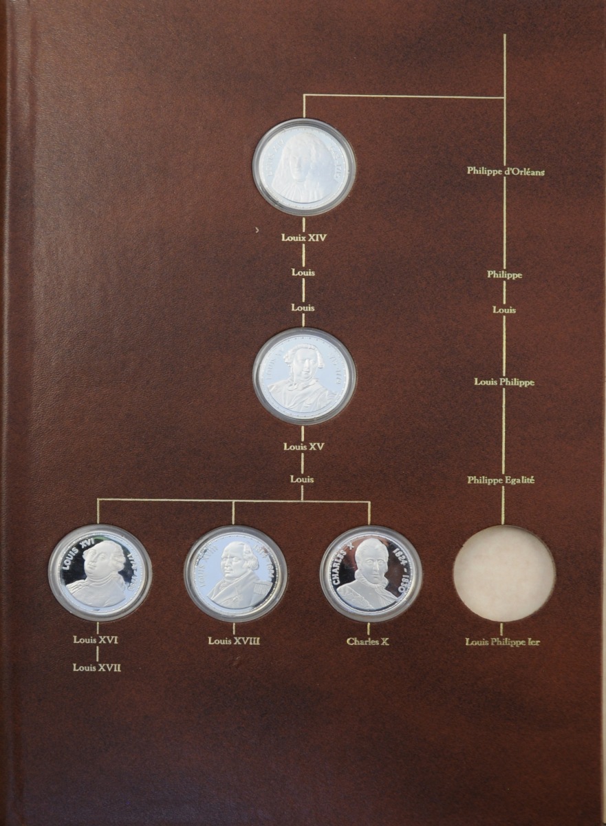 ALBUMS comprenant 46 MÉDAILLES en argent, Diam. 3,8 cm. De Clovis à Louis-Philippe Ier (deux manquantes : François II et Louis-Philippe Ier). Avec 20 notices biographiques. Poinçon crabe et poinçon d'orfèvre. Poids : environ 950 g.