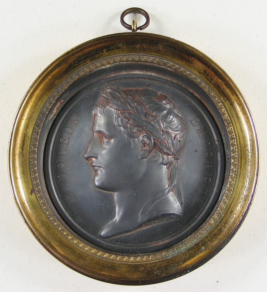 EMPIRE. Napoléon Ier, MÉDAILLON uniface en plomb au profil à gauche de l'Empereur par Andrieux, présenté dans un cadre en laiton doré.