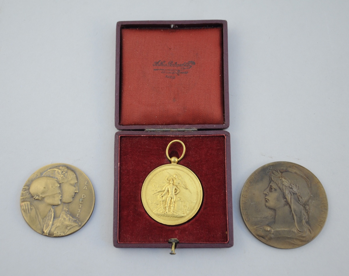 - La troisième en bronze doré : A/ Soldat et allégorie, marquée "Dévouement / Courage". R/ Marquée "Mutuelle Agricole d'Auneuil" dans une couronne de feuilles de chêne et laurier. Avec une bélière. Dans un coffret Arthus Bertrand. XXème. Diam. 4 cm.