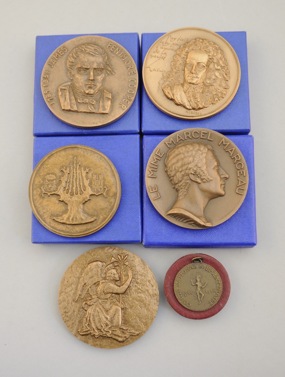 ARTISTES. LOT de 5 MÉDAILLES en bronze à l'effigie d'hommes célèbres : Filippino Lippi, Gottfried Wilhelm Leibniz, James Fenimore Cooper, Victor Hugo et le Mime Marceau. Poinçon de la Monnaie de Paris. Seconde moitié du XXème. Diam. moyen : 7 cm.