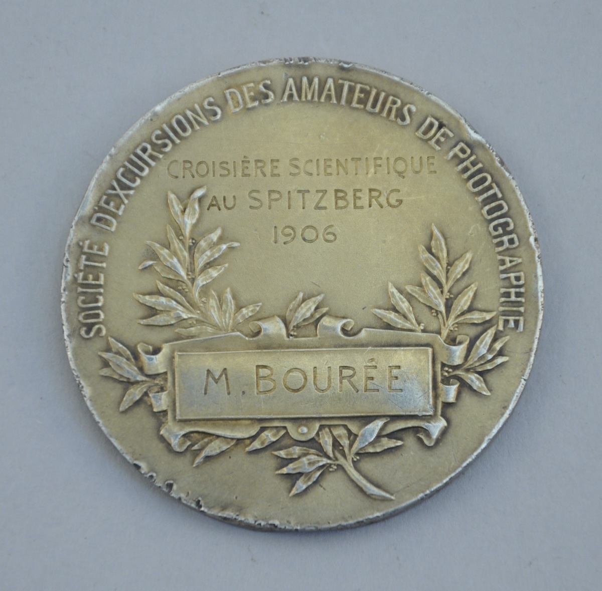 SCIENCES. MÉDAILLE en argent de la "Société d'excursion des amateurs de photographie" commémorant la "Croisière scientifique au Spitzberg" en "1906" pour "M. BOURÉE".