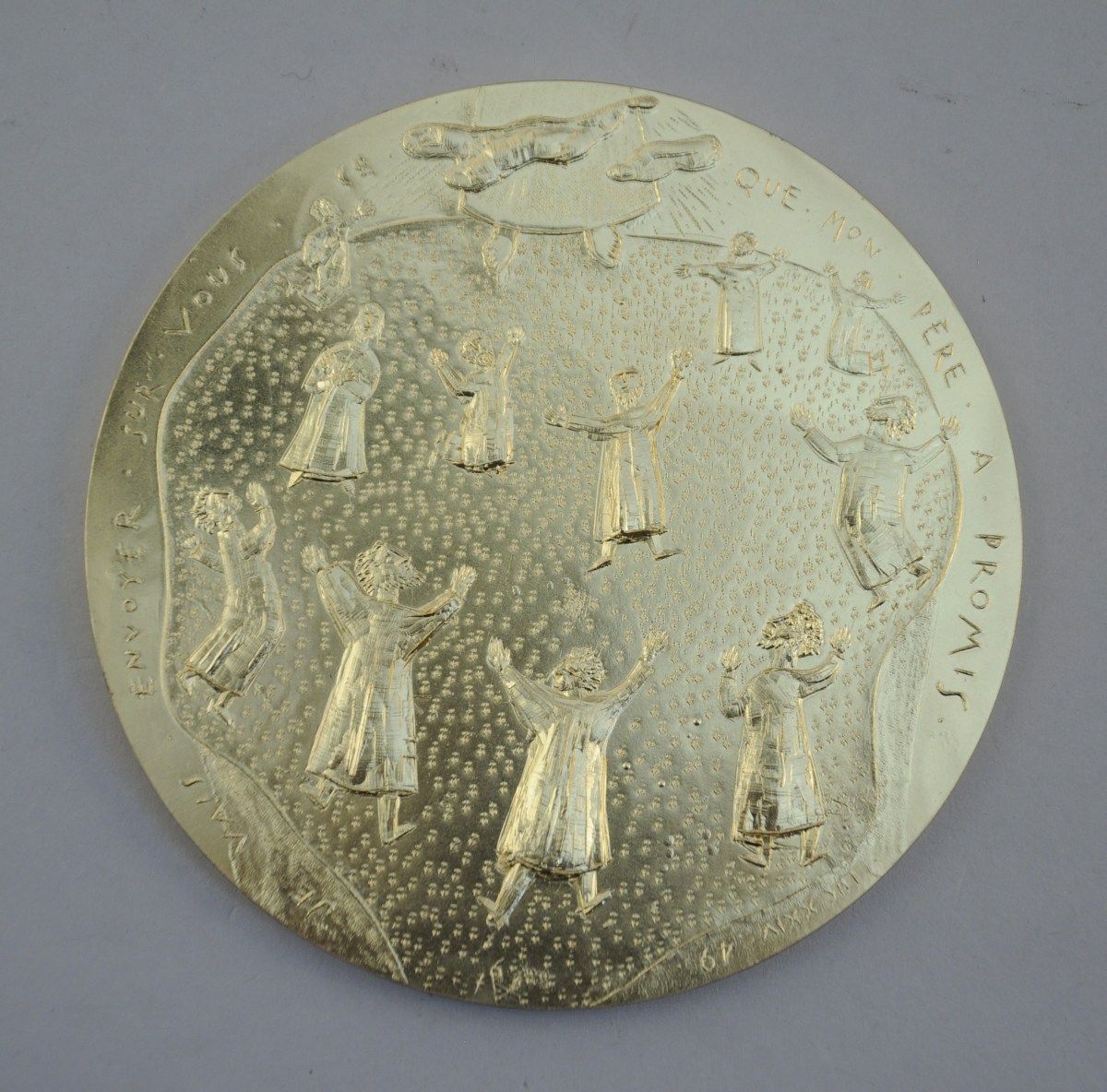 RELIGION. MÉDAILLE de la Pentecôte en bronze doré. A/ JE . VAIS . ENVOYER . SUR . VOUS . CE . QUE . MON . PÈRE . A . PROMIS. Une foule en adoration. Revers uni. Poinçon de la Monnaie de Paris et "BR" "FLOR". Diam. 13 cm.