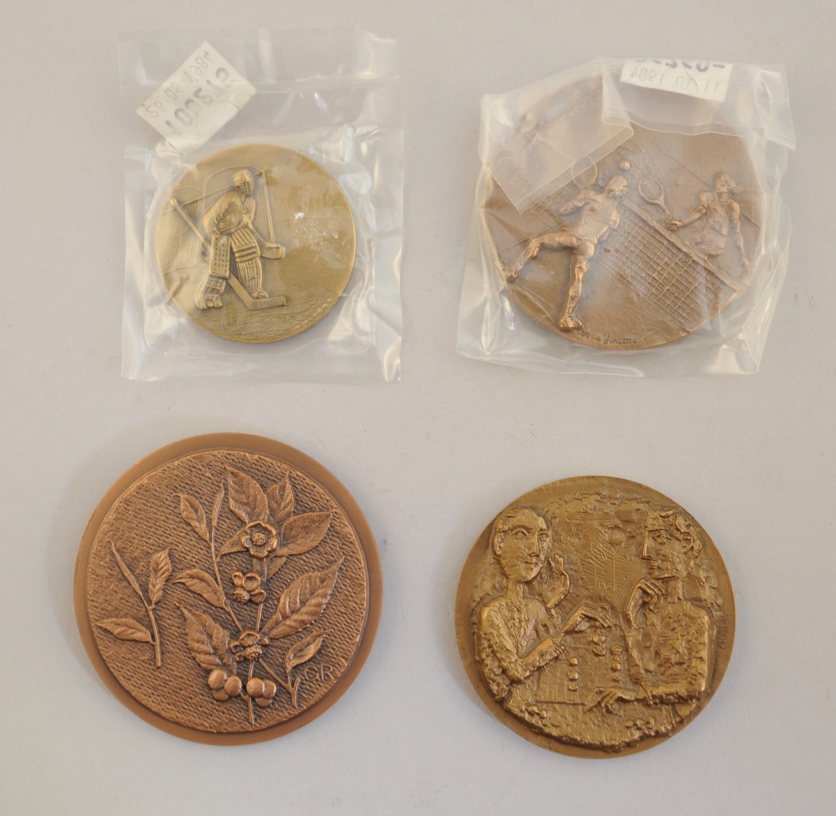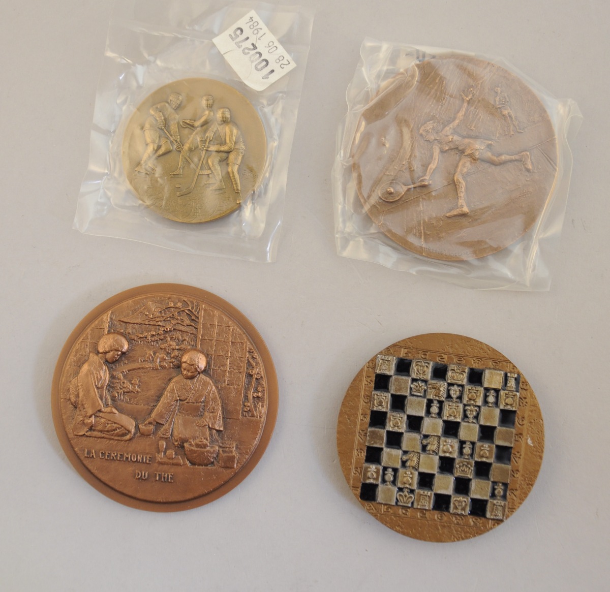 [SPORT ET LOISIRS]. 4 médailles commémoratives : "La cérémonie du thé" par GR; "Joueurs d'échecs", par Quillivic ; "Jockey" par S. Bret et "Tennis" par Dodie Yencesse. Formats divers.