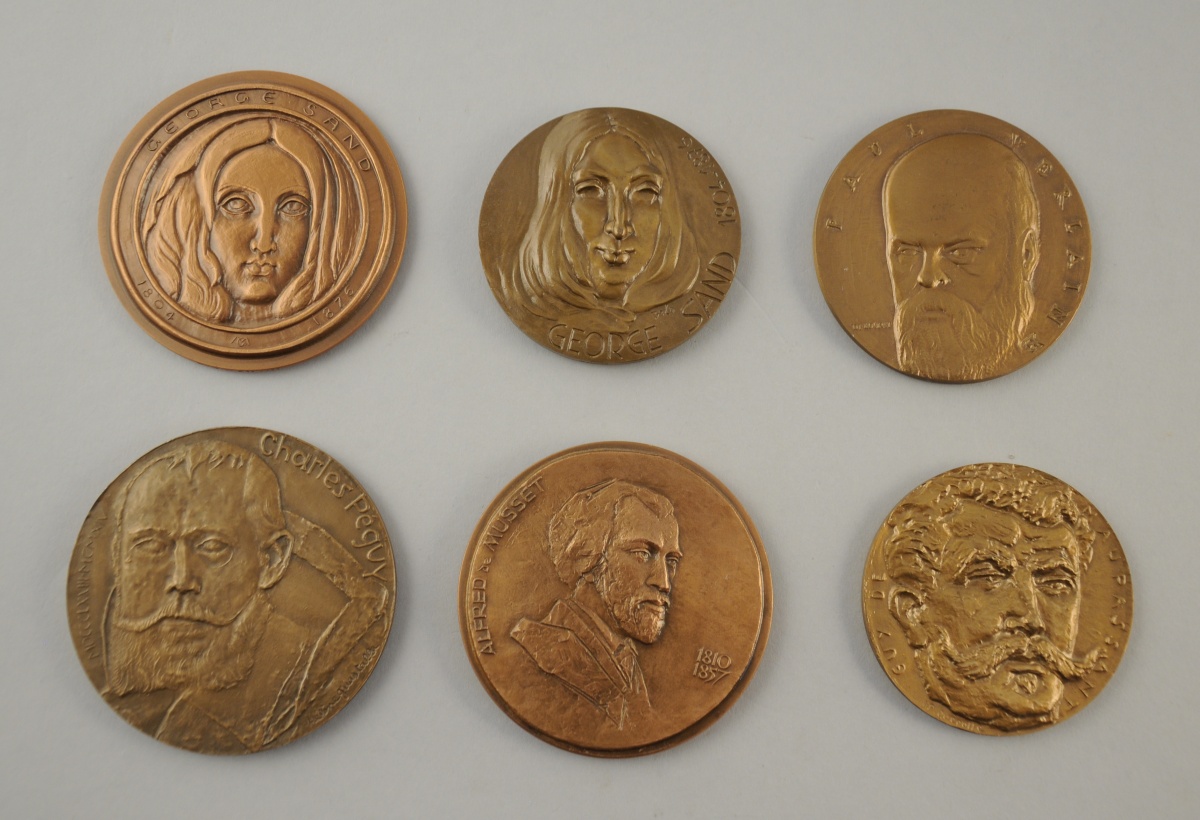 [LITTÉRATURE FRANÇAISE XIXe]. 6 médailles commémoratives : "George Sand" par Beco; "George Sand", par Muguet; "Guy de Maupassant", par Querolle; "Alfred de Musset", par Mocquot; "Charles Péguy", par Guastalla et "Paul Verlaine", par Flourat.