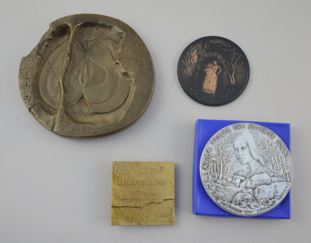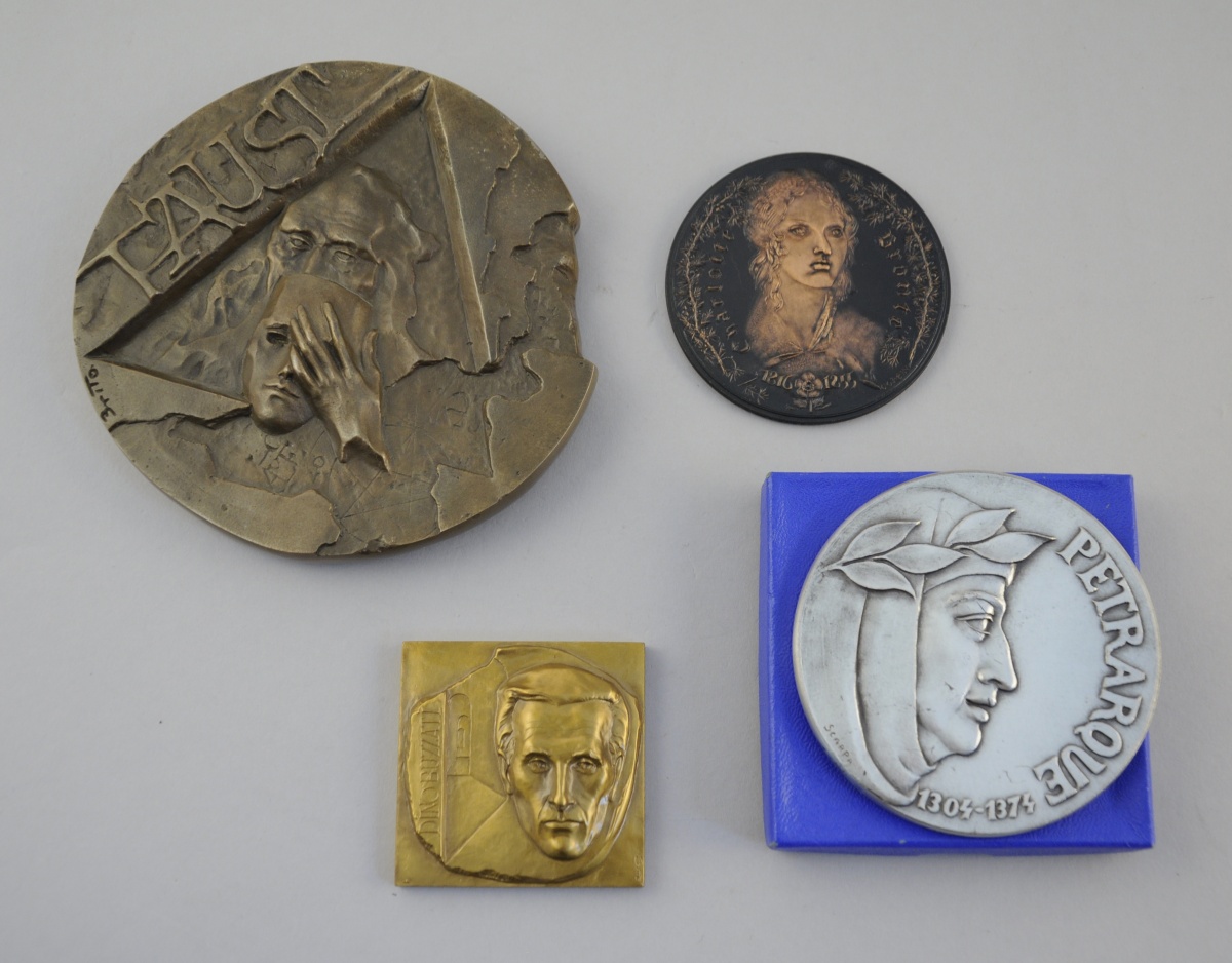 [LITTÉRATURE UNIVERSELLE]. 4 médailles commémoratives : "Faust", par Brito; "Charlotte Brontë", par Corbin; "Dino Buzatti", par Brito; et "Pétrarque", par Scarpa.