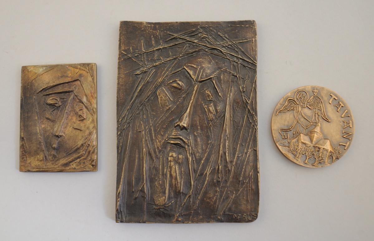 [RELIGION]. 3 médailles commémoratives dont deux non titrées marquées Debus et MD, respectivement, plus une commémorative du village de "Tavant" signée Landry.