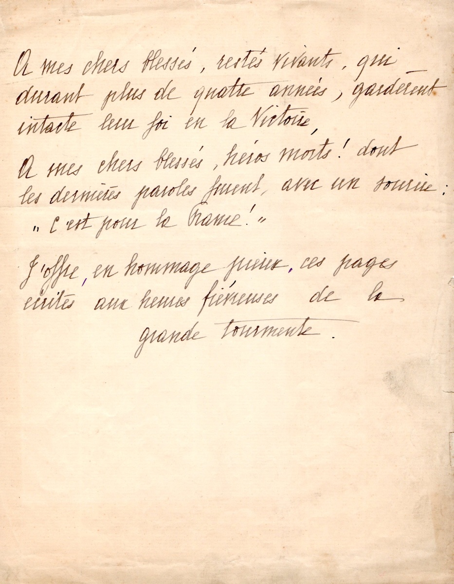 POESIE - GUERRE 1914-1918. Réunion de pages manuscrites ou tapuscrites écrites par la baronne de Baye, divers poèmes inspirés de son vécu en tant qu'infirmière bénévole sur le front, dont le recueil " A l'ombre du Drapeau " publié en 1922.