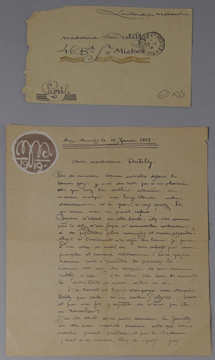 L.A.S., monogrammée, aux armées, 10 janvier 1918, à Madame Jeanne Dutilh, 3 pages, 25.5 x 20.5 cm, une enveloppe.