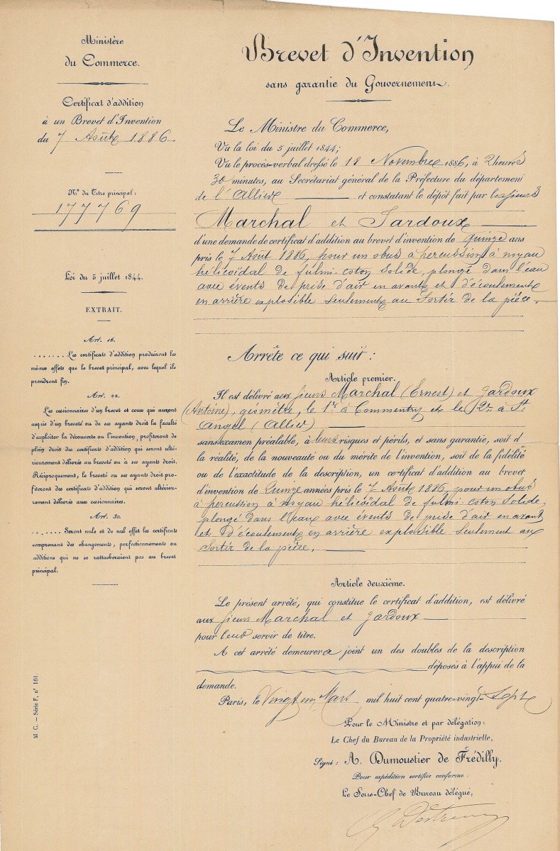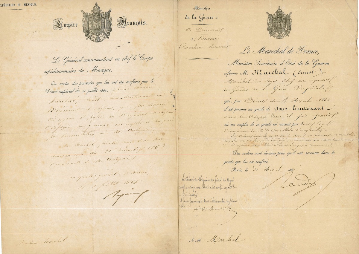 Réunion de + de 65 pièces (L.S., L.A.S., P.S. et divers) concernant la carrière militaire d'Ernest MARCHAL : 8 pièces relatives à sa carrière d'officier et à la campagne du Mexique dont diplôme de chevalier de l'ordre impérial mexicain de Notre Dame de Guadalupe signé par Maximilien Ier empereur du Mexique daté du 15 décembre 1864 avec cachet à sel ; lettre de la grande chancellerie donnant l'autorisation de porter la médaille de l'ordre mexicain, datée du 19 décembre 1865 et décorée d'une belle représentation en couleurs peinte de la médaille ; diplôme de la médaille commémorative de l'expédition du Mexique, 1864 - 46 pièces relatives à la campagne de 1870-1871 dont notes, ordres et correspondance adressées au lieutenant-colonel Marchal par le quartier général de la 3e division du 24e corps d'armée (dont L.S. du général Carré de Busserolles) - 5 pièces relatives à la promotion de chevalier de la légion d'honneur dont diplôme du 14 janvier 1872 - 9 pièces relatives au dépôt d'un brevet d'invention d'obus à charge de fulmicoton déposé par Marchal et Jardoux en 1887 - Portrait photographique d'Ernest Marchal par un studio londonien, 15 x 11,5 cm hors cadre - Portraits au crayon et rehauts d'Ernest Marchal et d'un enfant, avec envoi manuscrit daté du 17 juillet 1887 et signature d'Allan Österlind.