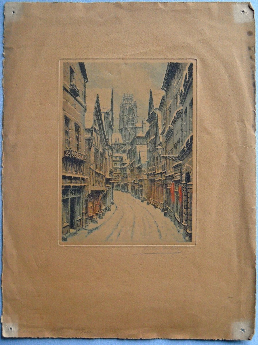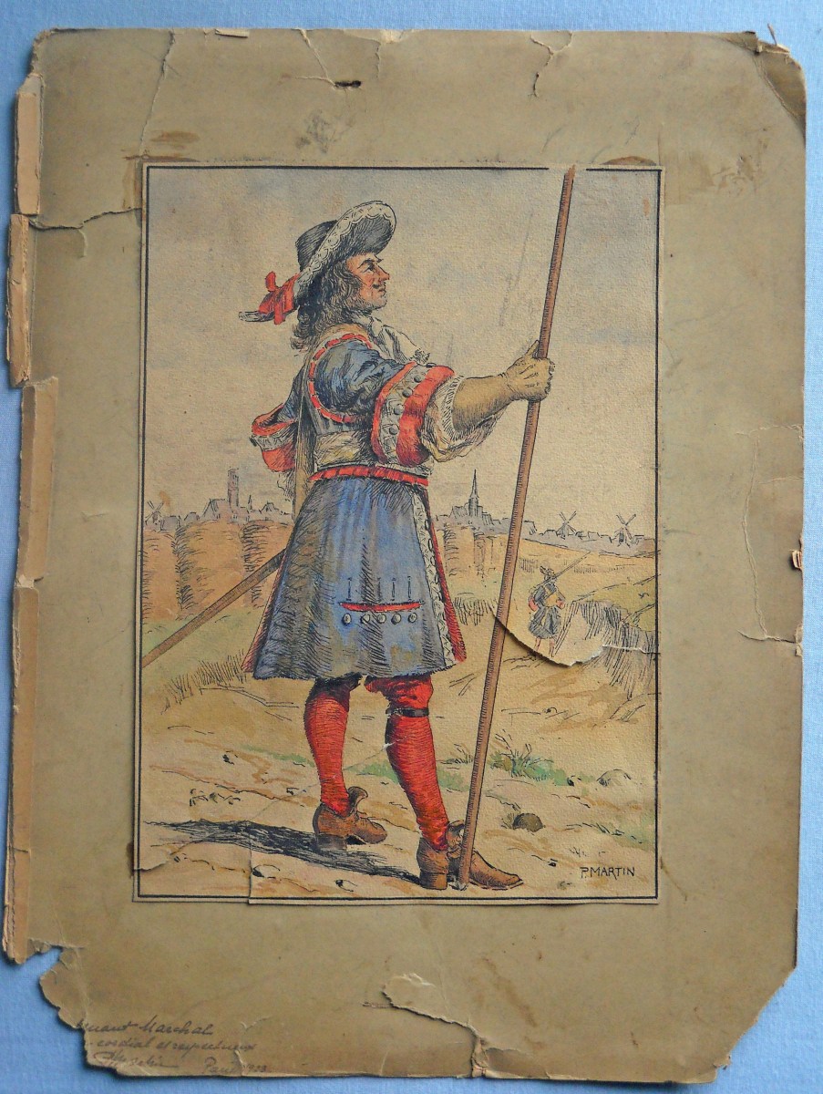 Lot de 14 documents et 25 clichés photographiques relatifs au déroulement de carrière d'Ernest Louis Adrien MARCHAL, dont : États de service durant la période 1914-1919 - Tapuscrit de 5 pages d'historiettes racontées par un témoin oculaire durant la guerre 1914-1918 - Carte des préparations de la guerre au cours de l'année 1917 éditée par L'Ouest-Eclair - Diplômes d'officier et de commandeur à l'ordre de Nichan Iftikhar de Tunisie, 1930 et 1945 - 16 clichés photographiques dont 14 vues aériennes des villes françaises et belges situées en zone de front (Bergues, Ypres, Dunkerque, Dixmude, etc), 1917-1918 - 9 photos de famille dont portrait du lieutenant Marchal - Vues de Rouen, paire d'eau-forte à rehauts de couleurs, signées " Victor Valéry " en bas à droite, , 34 x 25,5 cm - Portrait en pied d'un poilu, dessin encre et aquarelle par Charles Rocher de Gérigné (1890-1962), signé et daté 1931 en bas à droite, 27 x 19 cm - Portrait en buste d'une vieille femme à la coiffe , dessin à l'encre et crayon par Charles Rocher de Gérigné (1890-1962), signé et daté 1930 en bas à gauche, 32 x 24 cm - Cavalier de l'armée britannique, dessin à l'encre et aquarelle par " E. Rousselot " dédicacé et daté 1920 en bas à droite, 32,5 x 25,5 cm (acctds) - Soldat de l'armée française du XVIIe siècle, dessin à l'encre et aquarelle par " P. Martin ", dédicacé et daté Paris 1923 en bas à gauche, 37,5 x 28 cm (accdts).