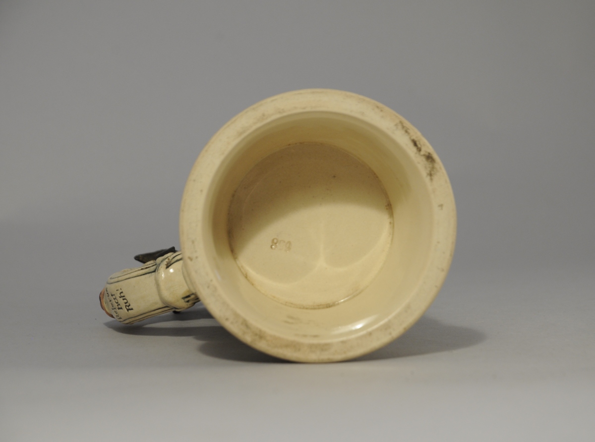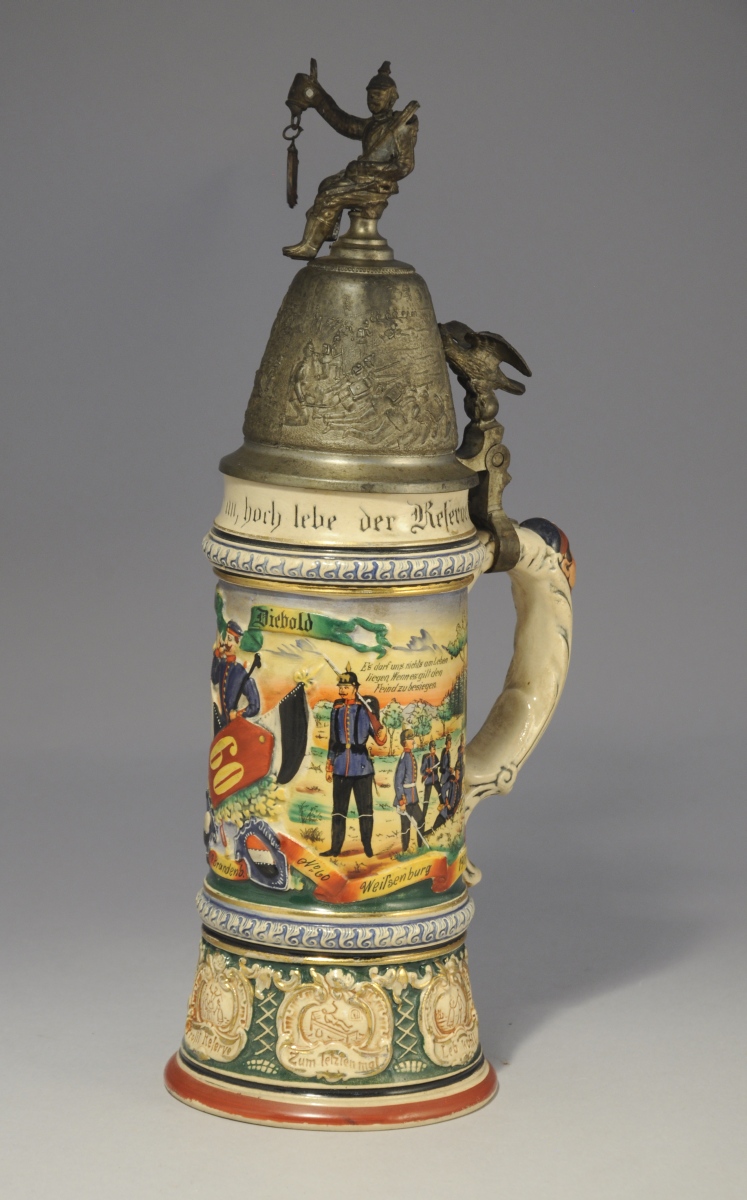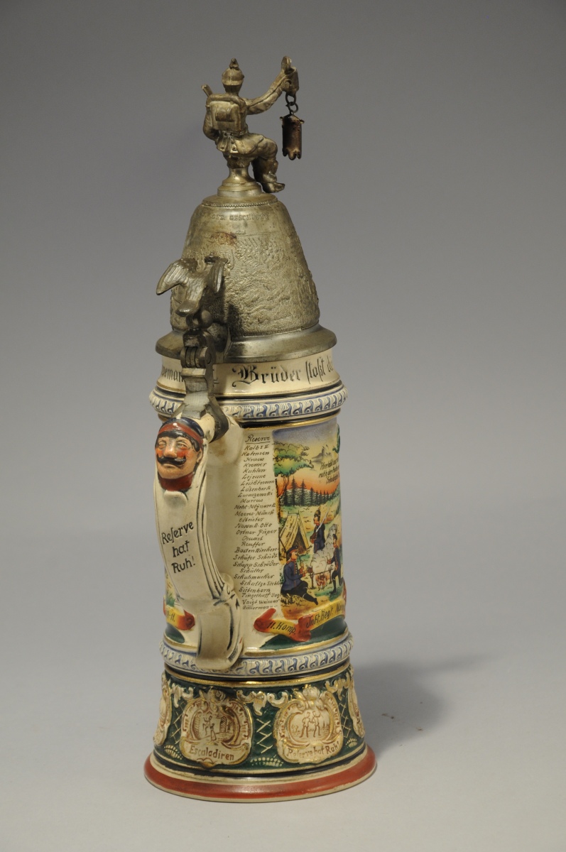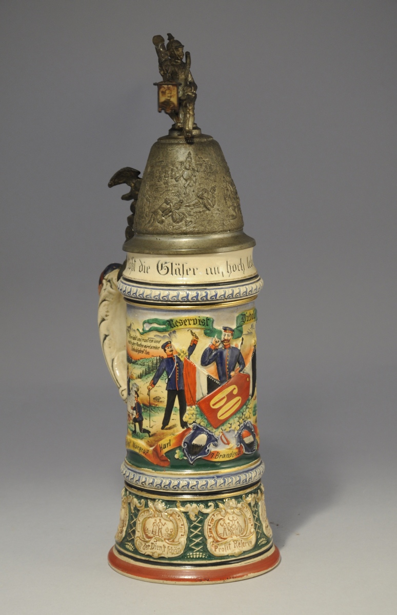CHOPPE DE RÉSERVISTE de la 11e compagnie du 60e régiment de Wissemburg en grès émaillé polychrome et rehauts or. Couvercle en étain.
