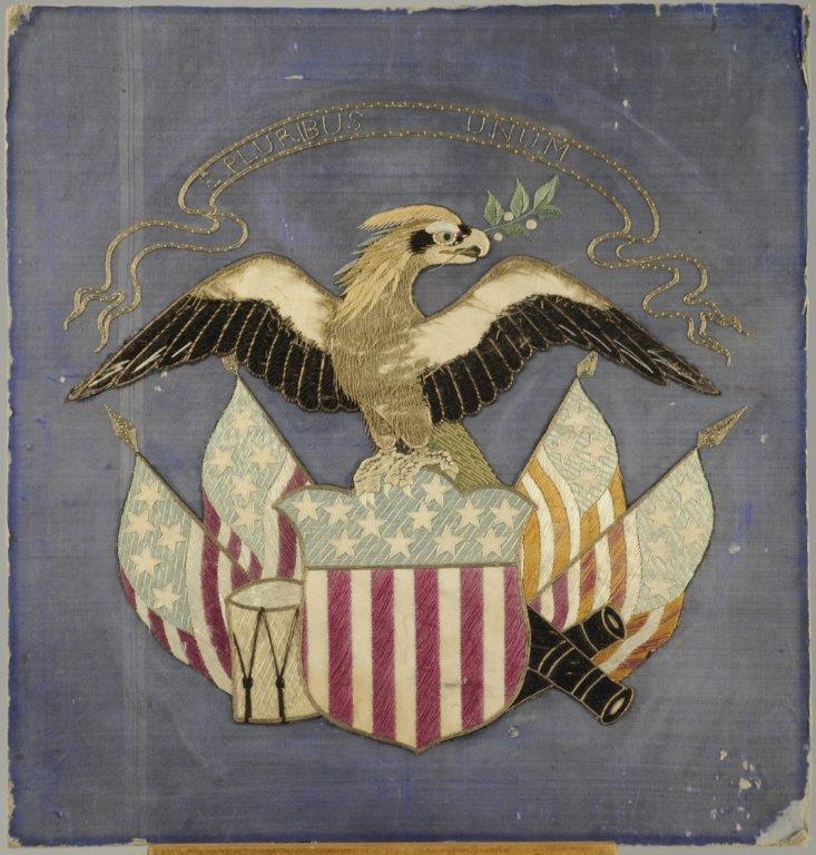 EMBLÈME AMERICAIN en soie tissée. 46 x 43,5 cm. (accidents)