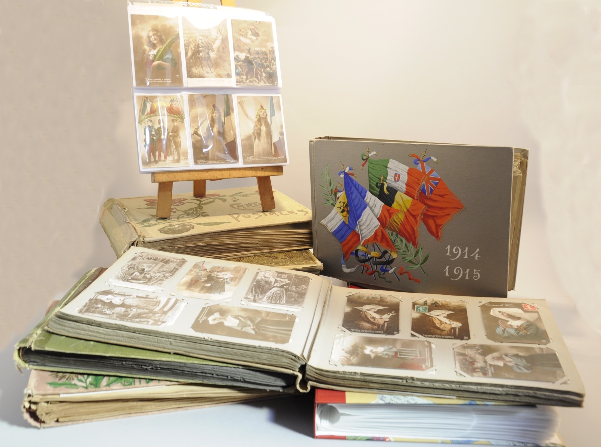 - album D. plus de 850 CP : drapeaux français, les Alliés, début de la guerre, défaites allemandes, drapeaux capturés, patrie honneur gloire, Déroulède, uniformes bleus, la Marseillaise, taisez-vous, emprunts, journée du poilu, restrictions, scènes de guerre, tranchées, attaques, photos de soldats, groupes, Noël, armée 1920-39, ruines, exode, vaguemestres, inhumations, prisonniers, bombardement de Paris...