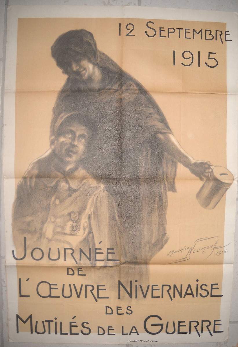 3 affiches à texte : " Reconstitution du foyer " [1915], Imprimerie Marcel Picard à Paris, 123 x 85 cm, traces de plis et manques, état moyen à B.E. - 2 affiches à texte : " Journée du 75, dimanche 7 février 1915, l'uvre du soldat au front ", imp. L. Pochy Paris, 76 x 55 cm - 2 affiches : " Journée des éprouvés de la guerre, le 26 septembre 1915 ", Aff. Camis Paris, 160,5 x 120 cm, traces de plis, déchirures et manque au coin gauche pour l'une, état moyen ; 119 x 79 cm, traces de plis, petits défauts en marge, B.E. - "12 septembre 1915, journée de l'uvre nivernaise des mutilés de la guerre " par Maurice Neumont, Devambez imp. Paris, 119 x 80 cm, traces de plis, T.B.E. - 2 affiches à texte : " Journée française du secours national