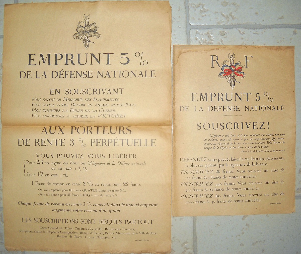 pour la victoire !... et le retour ! ", par Francisque Poulbot, publié sous les auspices de la Fédération nationale de la mutualité française qui fait appel à tous les travailleurs à tous les prévoyants à tous les patriotes pour la libération du territoire et la victoire finale, imp. Devambez Paris, 114 x 79 cm, traces de plis, T.B.E. - " Emprunt national. Émission de rente française perpétuelle 5%... Banque privée ", Impr. Chaix Paris, 80 x 60 cm, traces de plis, état moyen. - 5 affichettes à texte : " Emprunt 5% de la défense nationale souscrivez ! ", Impr. Nationale, 44 x 33 cm, mouillures, état moyen - 3 affiches : " Emprunt 5% de la défense nationale. En souscrivant