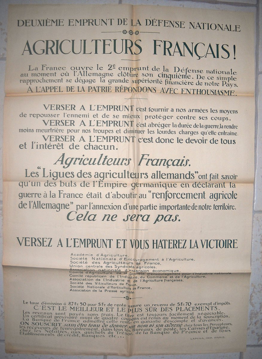 5 affiches : " Pour la victoire. Deuxième emprunt de la Défense Nationale, souscrivez " par A. Léchaudel, Impr. Nationale, 88 x 65 cm, traces de plis, petits défauts, B.E. - 7 affiches : " Français, souscrivez au deuxième emprunt de la défense nationale. Vous hâterez la victoire et vous aurez fait votre devoir envers la patrie. ", par Bernard Naudin, Impr. Crété, 119 x 79 cm, traces de plis, T.B.E. - 8 affiches : " On les aura ! 2e Emprunt de la Défense Nationale. Souscrivez " par Abel Faivre, Devambez impr. Paris, 113 x 79 cm, traces de plis, petits défauts, B.E. à T.B.E. - 7 affiches : " 2e emprunt de la défense nationale. En avant armée de l'épargne, c'est pour la patrie. " par Alcide Robaudi, Affiches photographiques Robaudy, Cannes, 118 x 81 cm, traces de plis, petits défauts, B.E. à T.B.E. - 6 affiches : " Deuxième emprunt de la défense nationale. Agriculteurs français versez à l'emprunt et vous hâterez la victoire. ", Imp. Lapina Paris, 114 x 80 cm, traces de plis, B.E. à T.B.E. - " Banque de France. Emprunt de la défense nationale