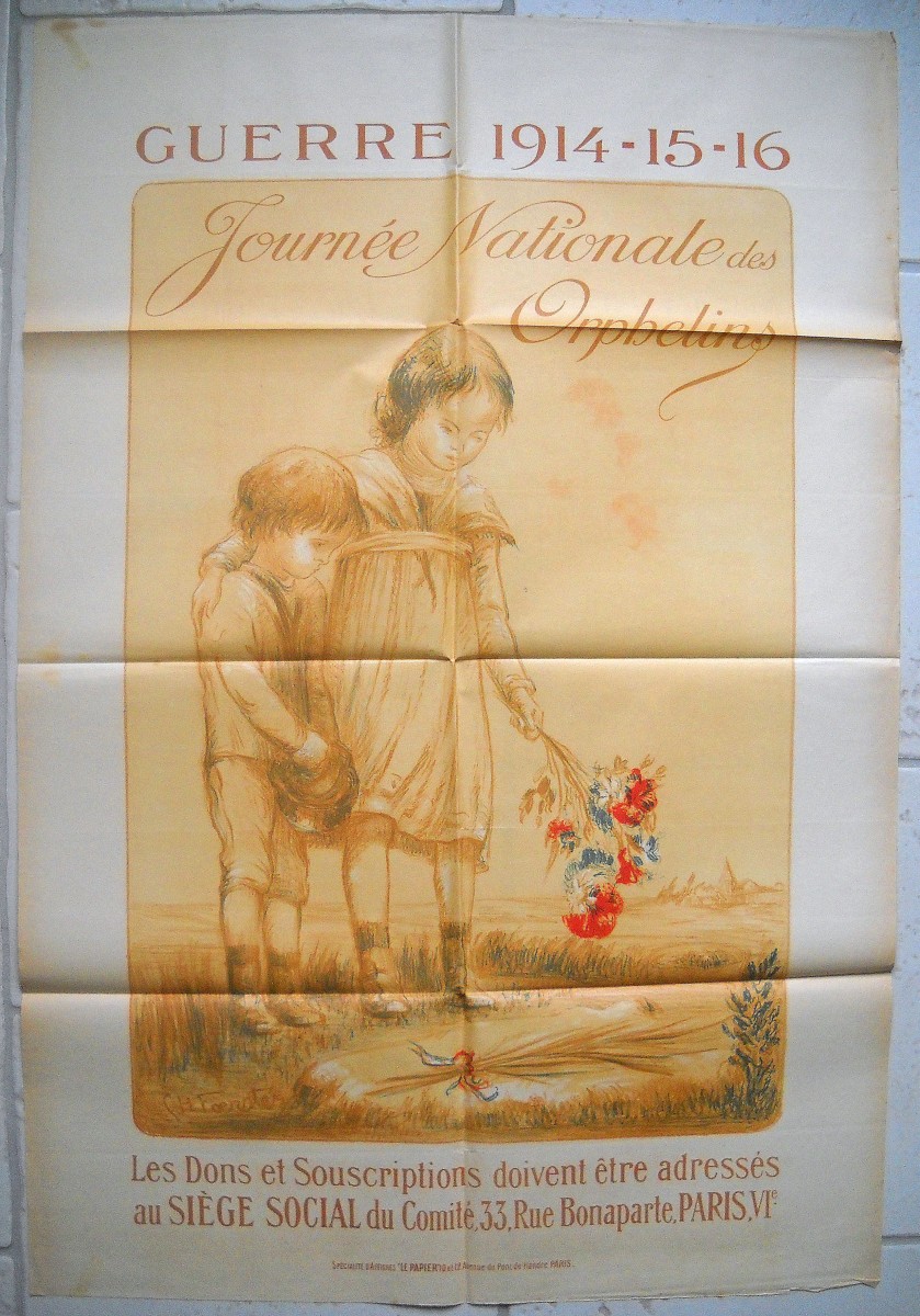 3 affiches : " Guerre 14-15-16, journée nationale des orphelins " par Charles Foerster, 119 x 80 cm, traces de plis, B.E. - 3 affiches à texte : " Guerre 1914-1915-1916, journée nationale des orphelins, 1er et 2 novembre 1916 ", 80 x 60 cm (2) et 119 x 80 cm, traces de plis, T.B.E. - 2 affiches : " Journée nationale des orphelins, guerre 1914-15-16 " par Bernard Naudin, 119 x 80 cm, traces de plis, T.B.E. - " Journée de l'orphelinat des armées, 20 juin 1915 " par Alfred Philippe ROLL, imp. Pichot Paris, 119 x 161 cm, traces de plis, T.B.E. - " Office national des pupilles de la nation, 14 juillet 1918 " par Adolphe WILLETTE, Devambez Paris, 113 x 79 cm, traces de plis et petits défauts en marge, B.E.