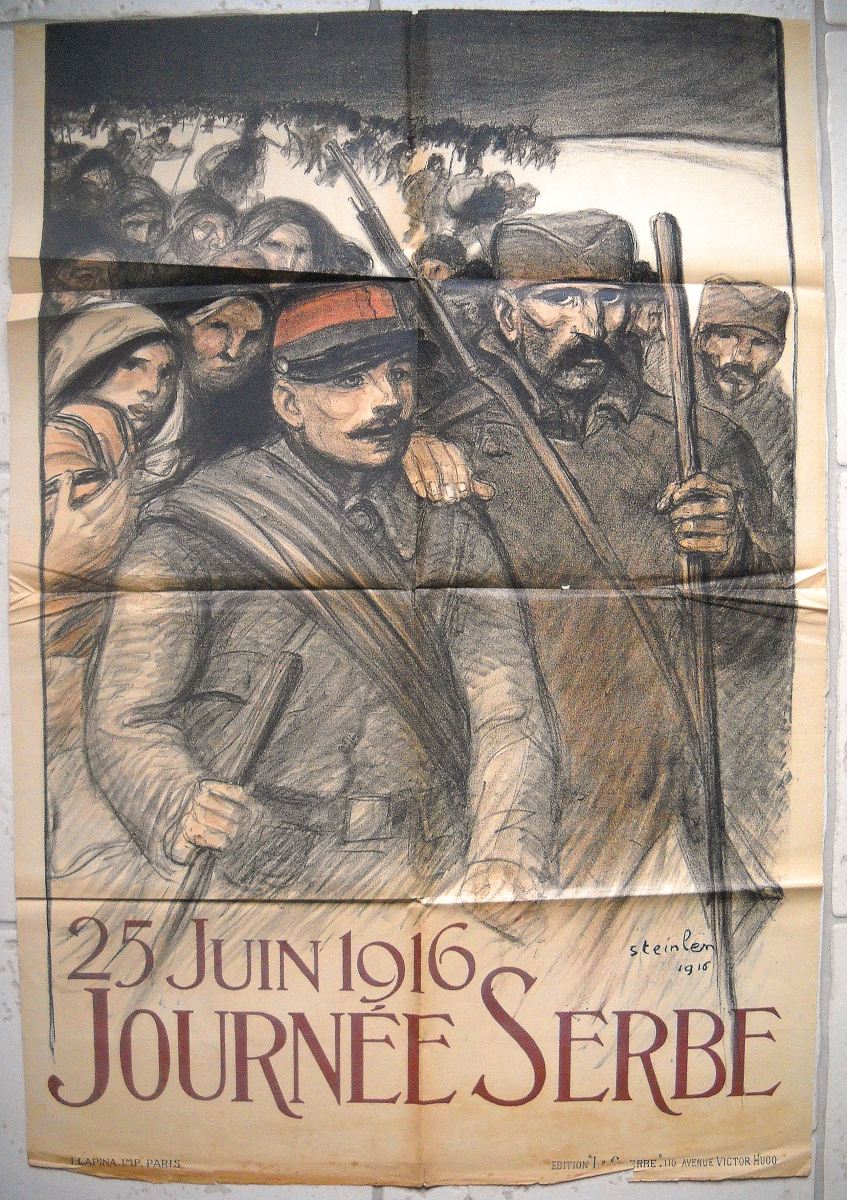 2 affiches : " La journée serbe, 23 juin 1916, anniversaire de la bataille de Kossovo " par Charles Fouqueray, Devambez imp. Paris, 114 x 80 cm, traces de plis, T.B.E. - " 25 juin 1916, journée serbe " par Théophile Alexandre Steinlen, Lapina imp. Paris, 118 x 81 cm, traces de plis et petits défauts, B.E. - Affiche à texte : " Journée serbe organisée à la demande du gouvernement de la république par le comité du secours national pour le dimanche 25 juin