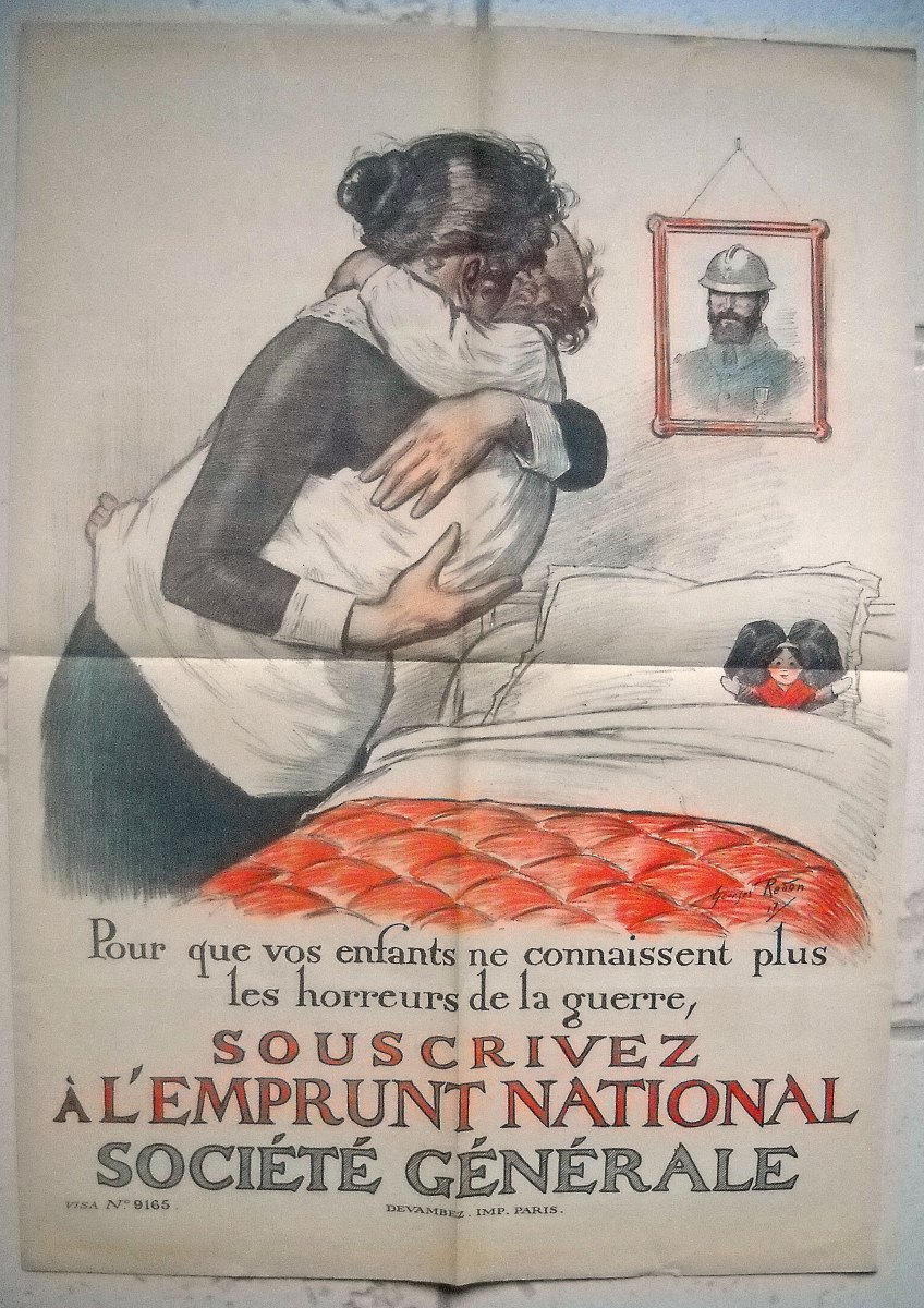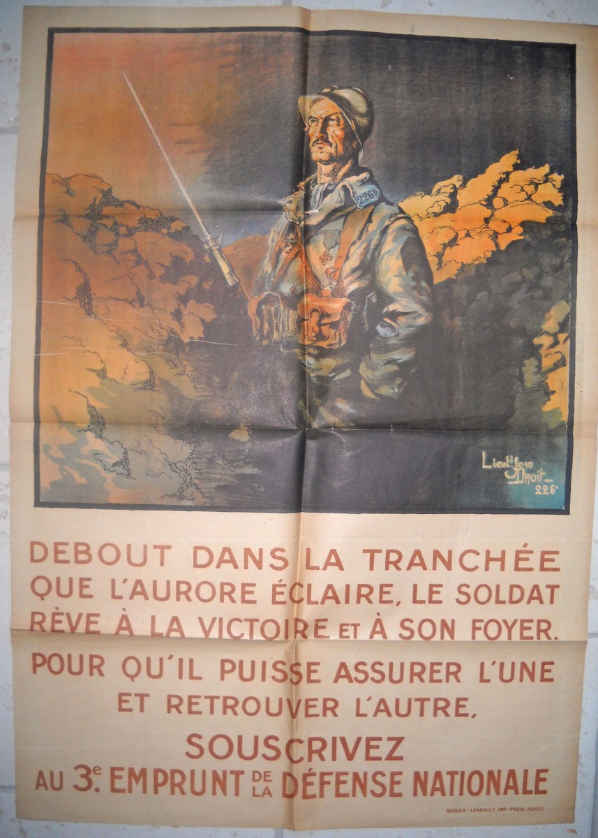 " Pour que vos enfants ne connaissent plus les horreurs de la guerre, souscrivez à l'Emprunt National Société Générale " par Georges Redon, 81 x 57 cm, traces de plis, T.B.E. - " République Française. 3e Emprunt de la Défense Nationale " par Delong, Draeger imp., 80 x 119 cm, traces de plis, T.B.E. - 4 affiches : " Pour la France qui combat !, Pour celle qui chaque jour grandit ! 3e EMPRUNT de la Défense Nationale, souscrivez" par Auguste Leroux, Imp. Joseph Charles Paris, 114 x 80, traces de plis, état moyen à T.B.E. - 2 affiches : " 3e emprunt de la défense nationale, Crédit Lyonnais, souscrivez ! " par Abel Faivre, 80 x 57 cm, traces de plis, B.E. à T.B.E. - " Debout dans la tranchée que l'aurore éclaire le soldat... 3e Emprunt de la défense nationale " par lieutenant Jean Droit, Imp. Berger-Levrault, Paris-Nancy, 113 x 80 cm, traces de plis, B.E. - " 3e emprunt de la défense nationale. Souscrivez pour hâter la paix par la victoire. " par Albert Besnard, Maquet Gr. Paris, 113 x 80 cm, traces de plis, T.B.E. - " Défense Nationale Emprunt en rentes françaises 4 pour cent exemptes d'impôts. Echéance du premier coupon : 16 Mars 1918. Etc... Souscription ouverte du 26 Novembre au 10 Décembre 1917. On souscrit à la Banque de France.? ", Imp. Draeger, 100 x 65 cm, traces de plis, T.B.E.
