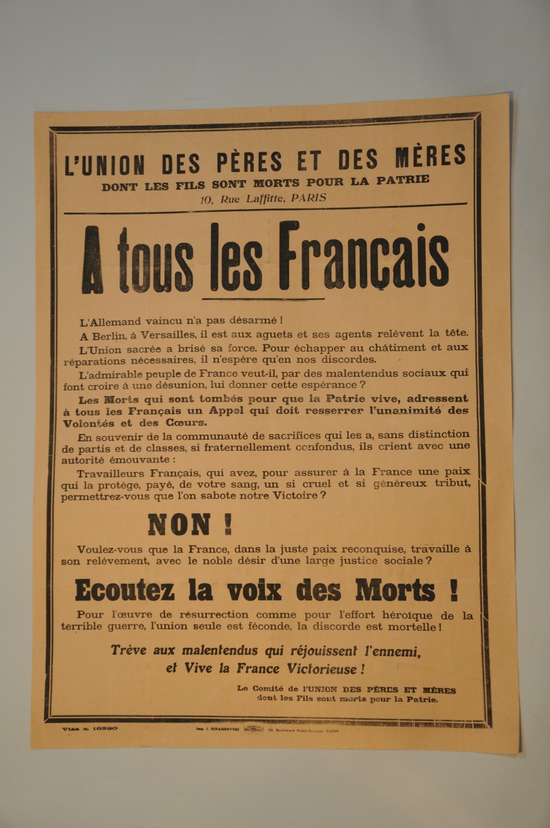"L'union des Pères et des Mères dont les Fils sont Morts pour la France."