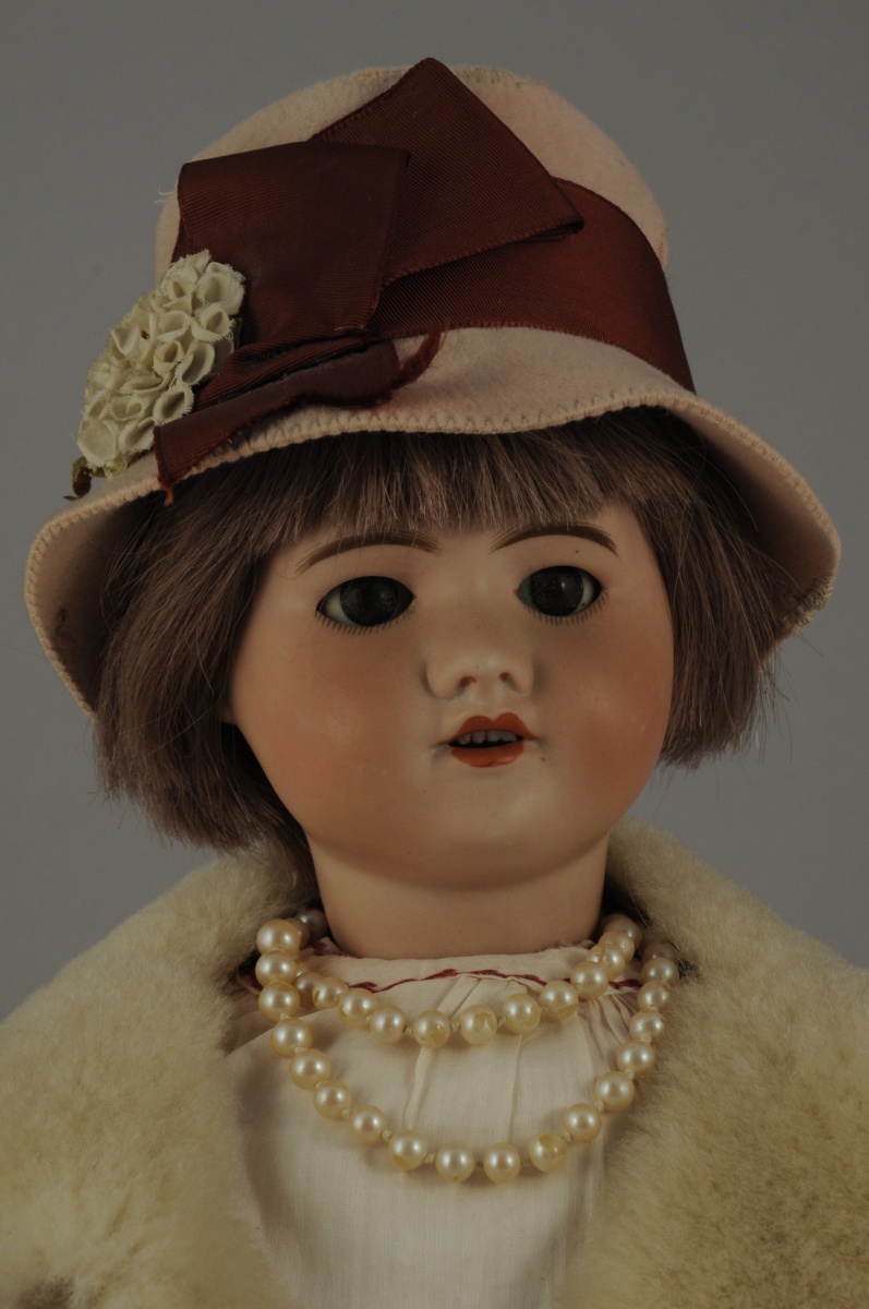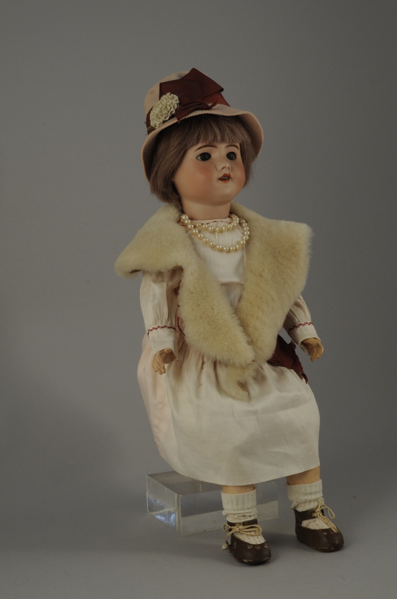 POUPÉE, tête porcelaine "SFBJ 60 PARIS 5", bouche ouverte, yeux sulfure bleus foncés, corps articulé, grille, habits, perruque. Haut. 47 cm. Collection orléanaise.