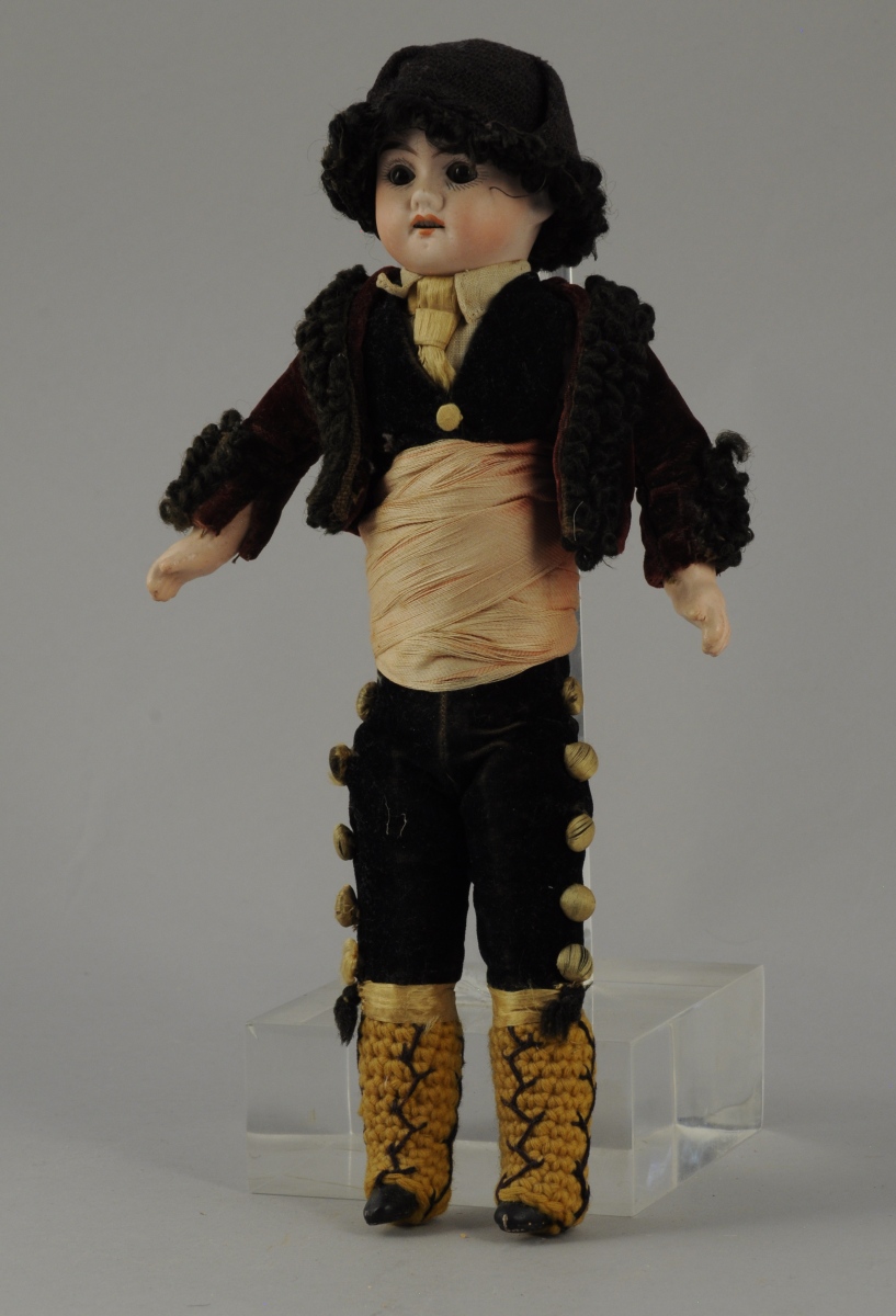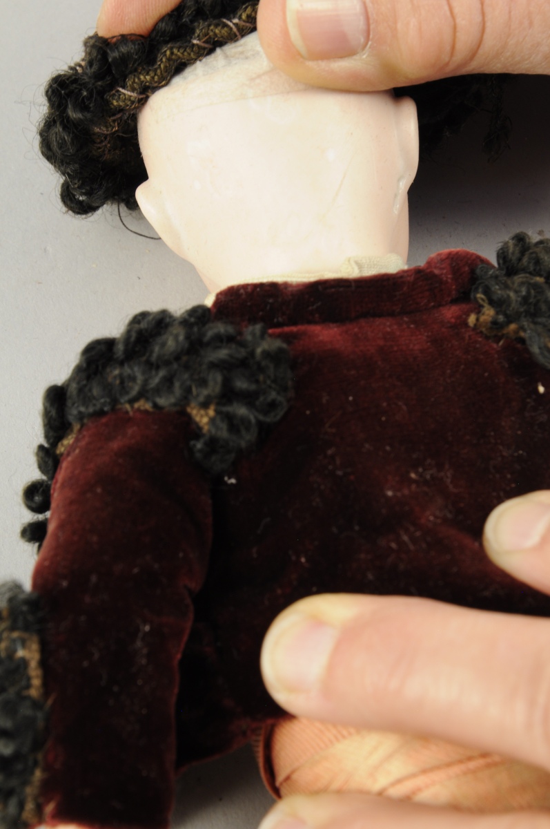 POUPÉE, tête porcelaine "0/0" en creux, bouche ouverte, yeux sulfure bleus, corps bois, habits. Haut. 27 cm. (accdts). Collection orléanaise.