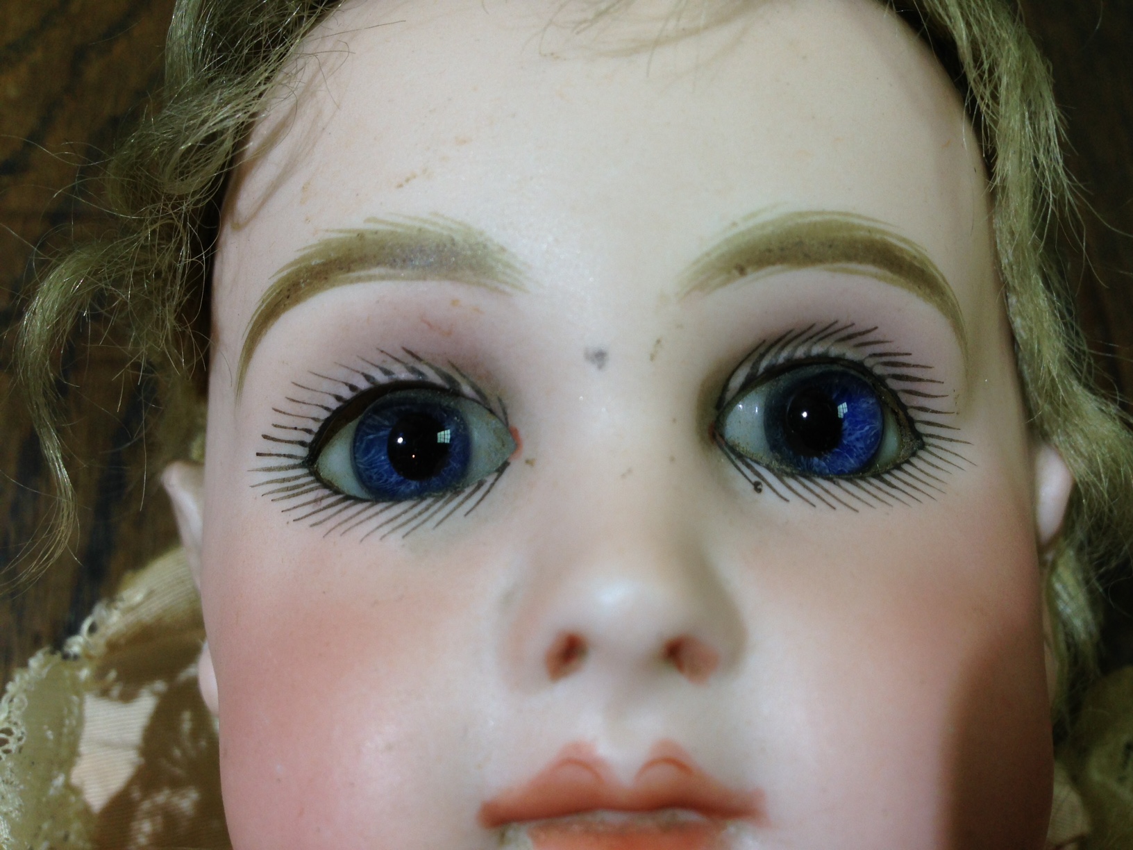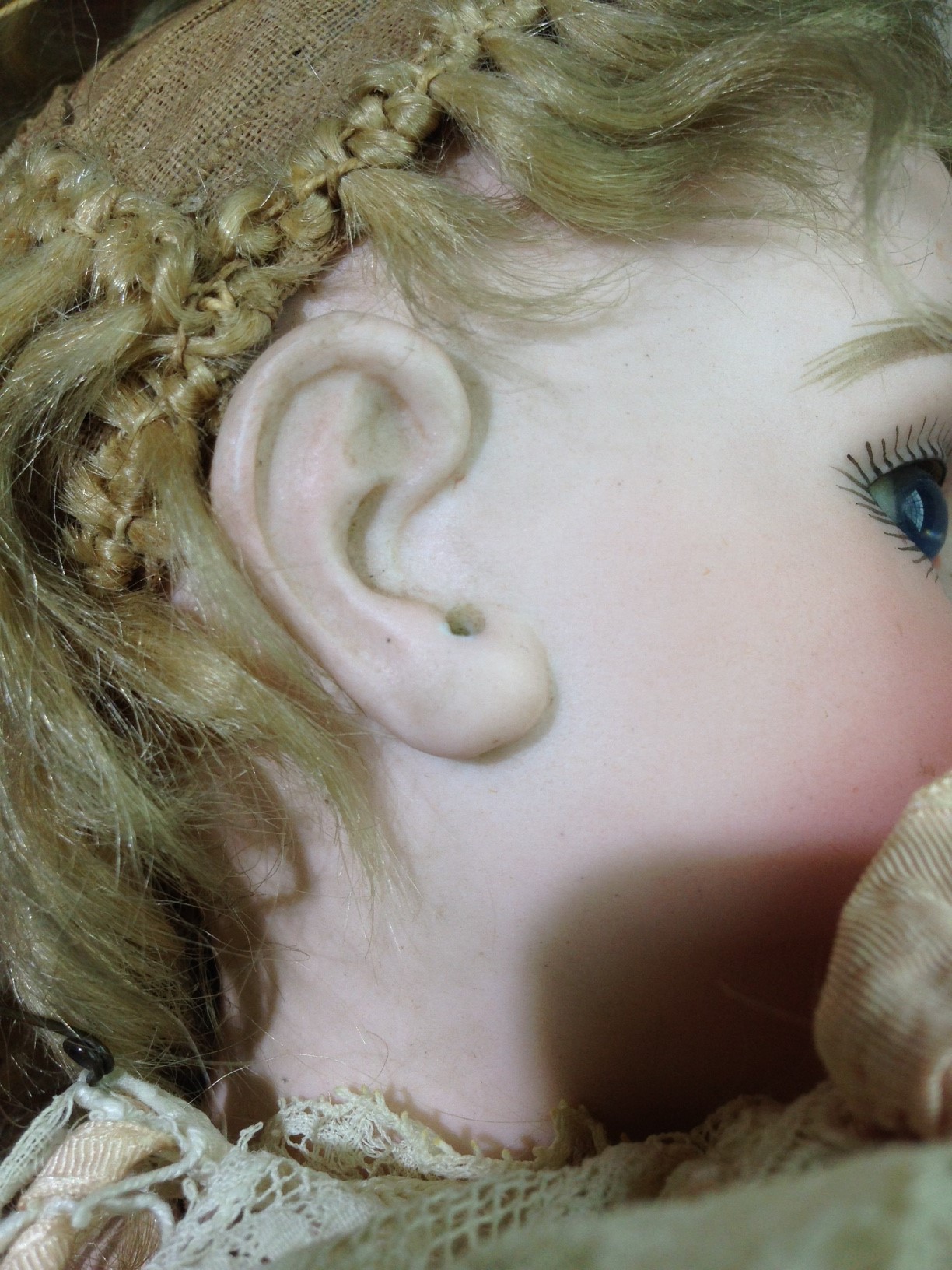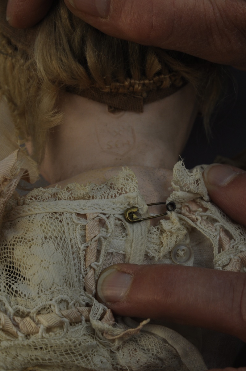 SCHMITT & Fils. Rare BÉBÉ SCHMITT tête en biscuit, yeux bleus en sulfure, cheveux naturels, corps et membres articulés. Signée "SCH", taille "8". Vêtue d'une robe blanche ancienne.