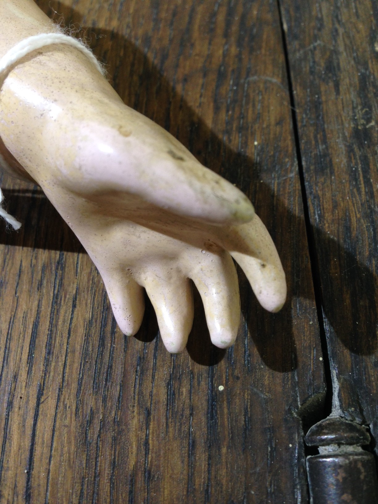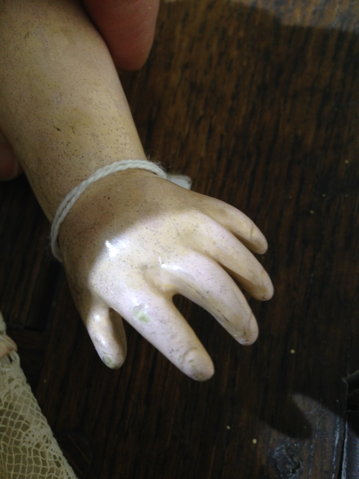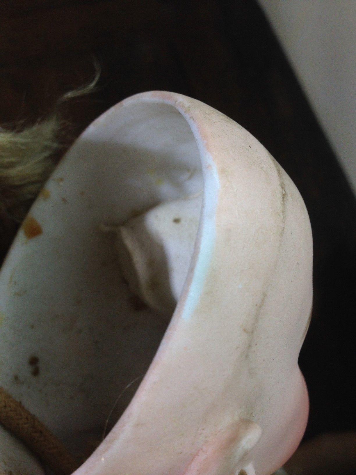 SCHMITT & Fils. Rare BÉBÉ SCHMITT tête en biscuit, yeux bleus en sulfure, cheveux naturels, corps et membres articulés. Signée "SCH", taille "8". Vêtue d'une robe blanche ancienne.