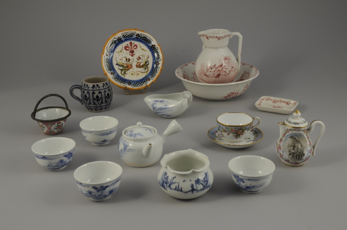 -DIVERS : une VERSEUSE en porcelaine à décor polychrome en décalcomanie d'une vue de l'Hôtel du Cardinal Jouffroy à Luxeuil et de fleurs; une TASSE À THÉ et sa SOUS-TASSE en porcelaine partiellement émaillée bleu à décor polychrome de roses; un PANIER en porcelaine de la Chine de la famille rose émaillé polychrome de fleurs. Monture en bronze; un PLAT en faïence à décor polychrome de grotesques et une CHOPPE en grès à décor en bleu de ferroneries. XXe.