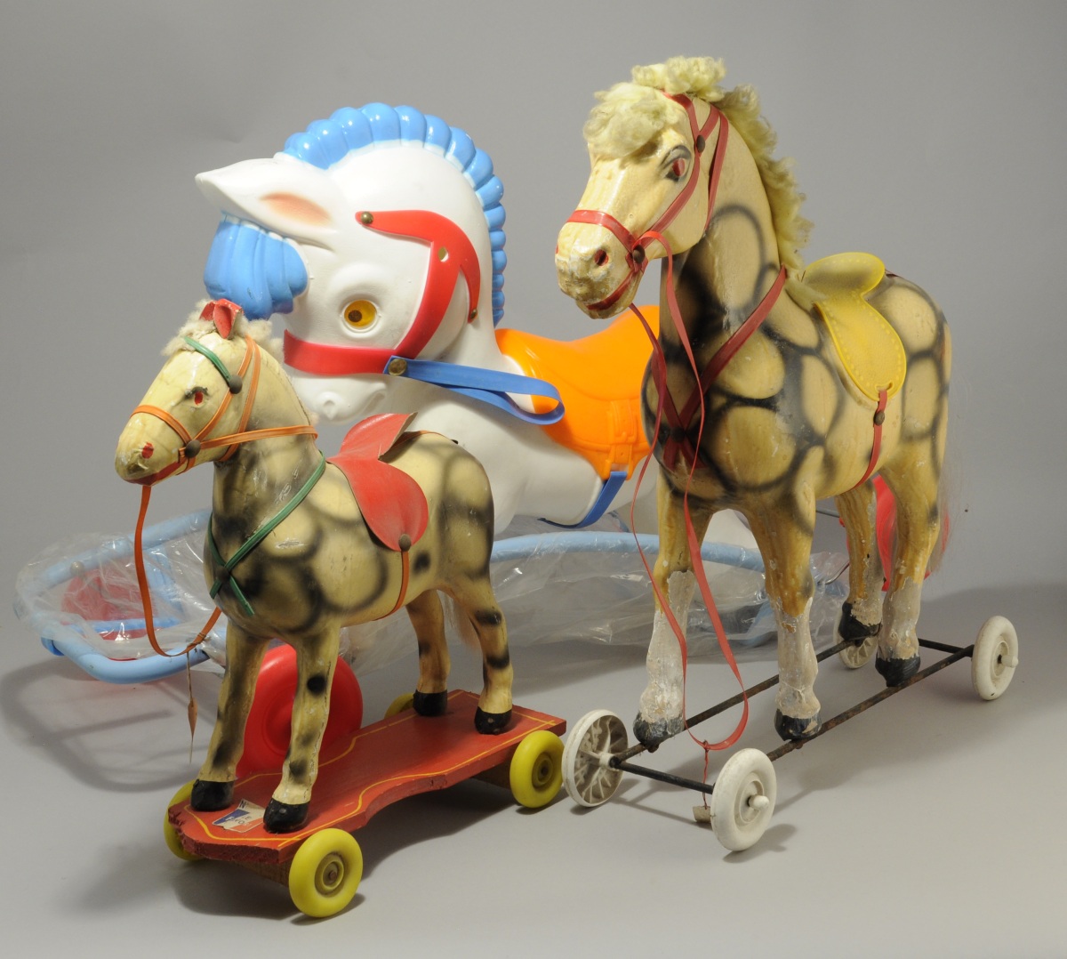 - LE FAVORI. DEUX CHEVAUX SUR ROULETTES en carton bouilli laqué. Le plus grand référencé 505 et acheté 26 F en 1968.