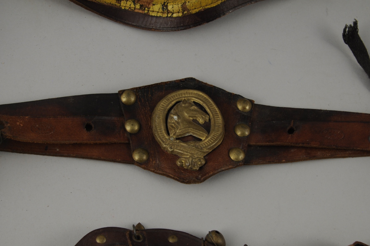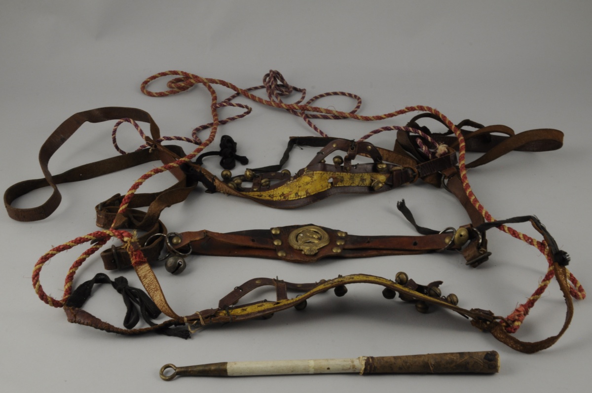 TROIS HARNACHEMENTS ornementaux pour poney, en cuir et corde, avec grelots.