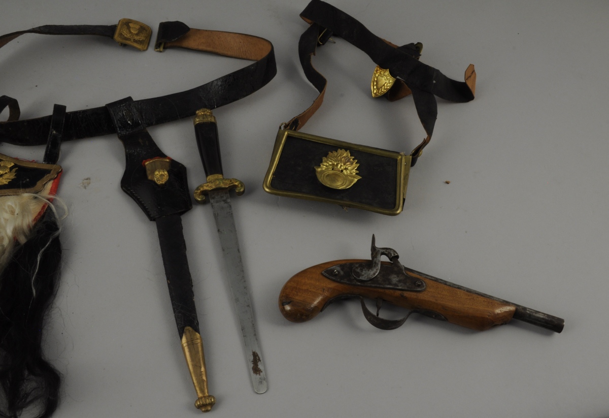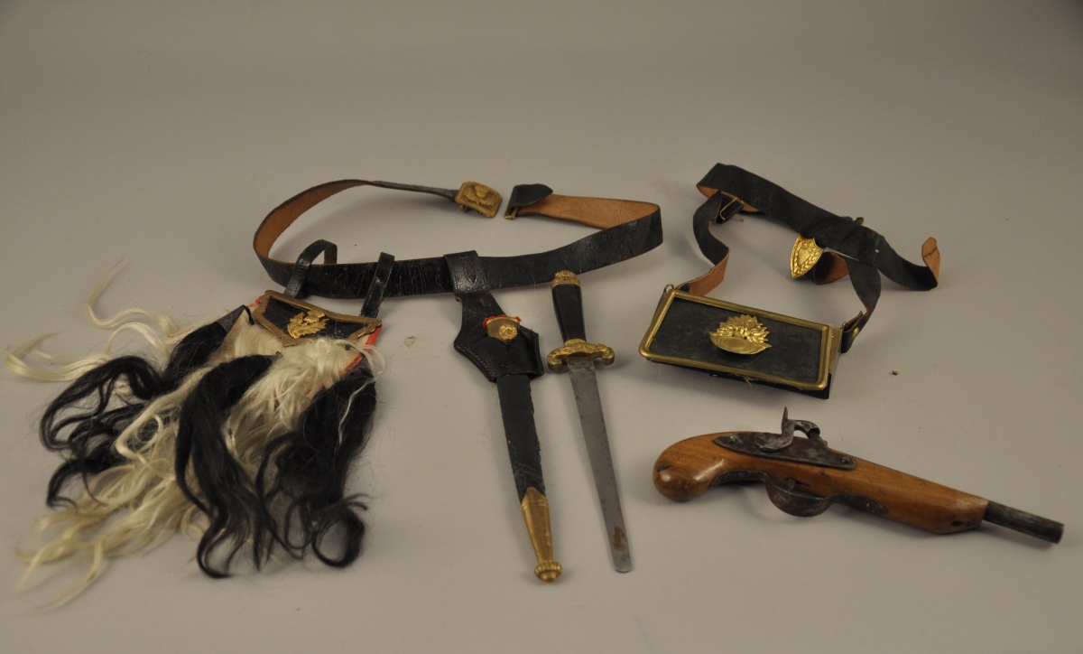 BAUDRIER en cuir et POIGNARD écossais en métal pour enfant, comprenant un écusson en crin synthétique, et décor en laiton.