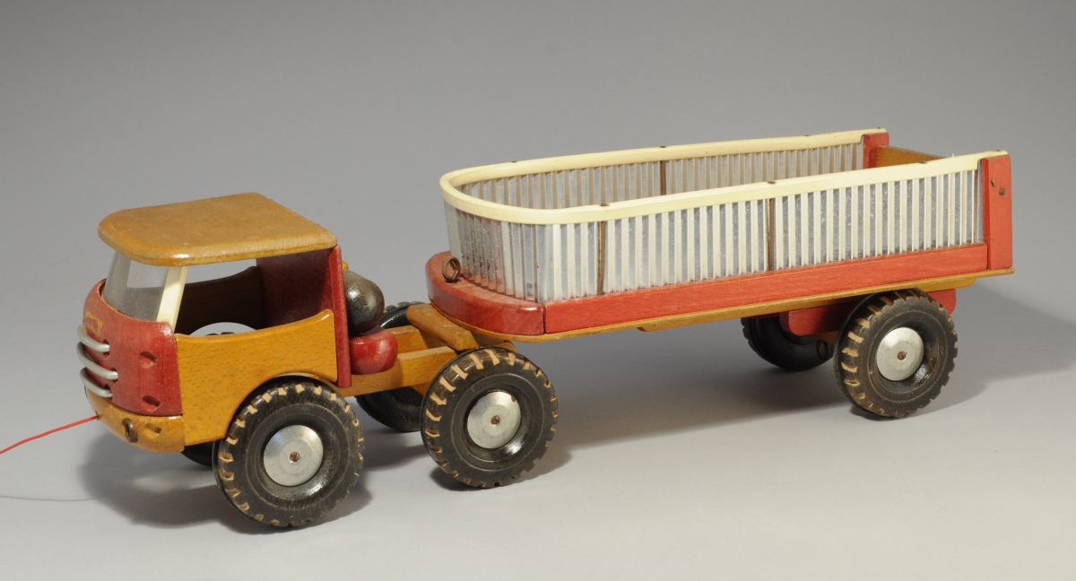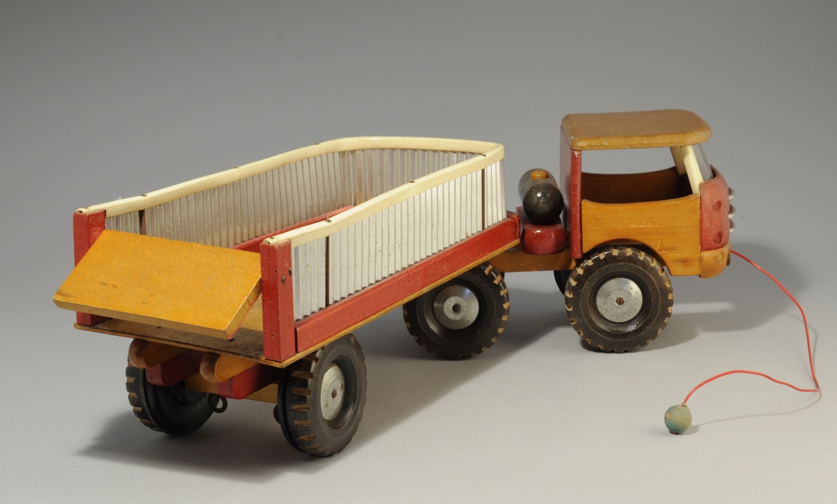 DEJOU. CAMION SEMI-REMORQUE en bois naturel et polychrome verni. Remorque...