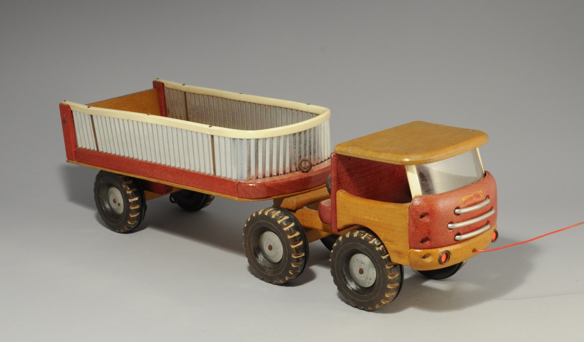 DEJOU. CAMION SEMI-REMORQUE en bois naturel et polychrome verni. Remorque aluminium. N° 662 du catalogue de 1960.